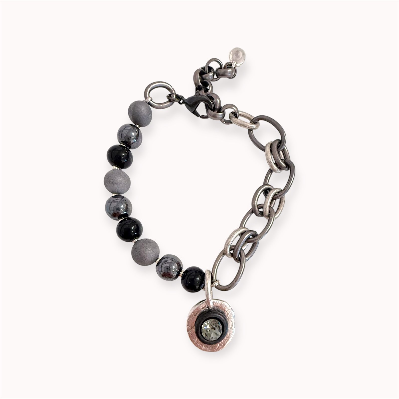 Pilka apyrankė su hematitu, oniksu, agatu ir Swarovski pakabuku
