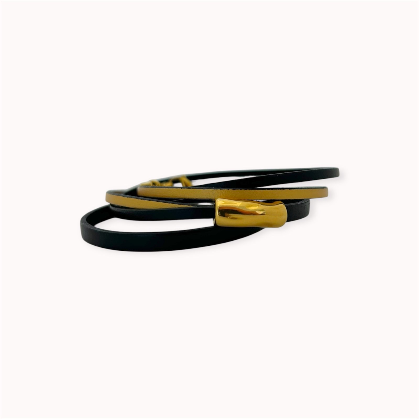 Ši natūralios juodos ir auksinės odos apyrankė trigubai apvyniojama aplink ranką sukuria masyvų vaizdą pasitelkiant tik vieną aksesuarą. Puikiai tinka ir derinti su kitomis apyrankėmis, tačiau ir viena atrodo išskirtinai. Auksu dengta detalė įneša šiek tiek spindesio jūsų įvaizdžiui.