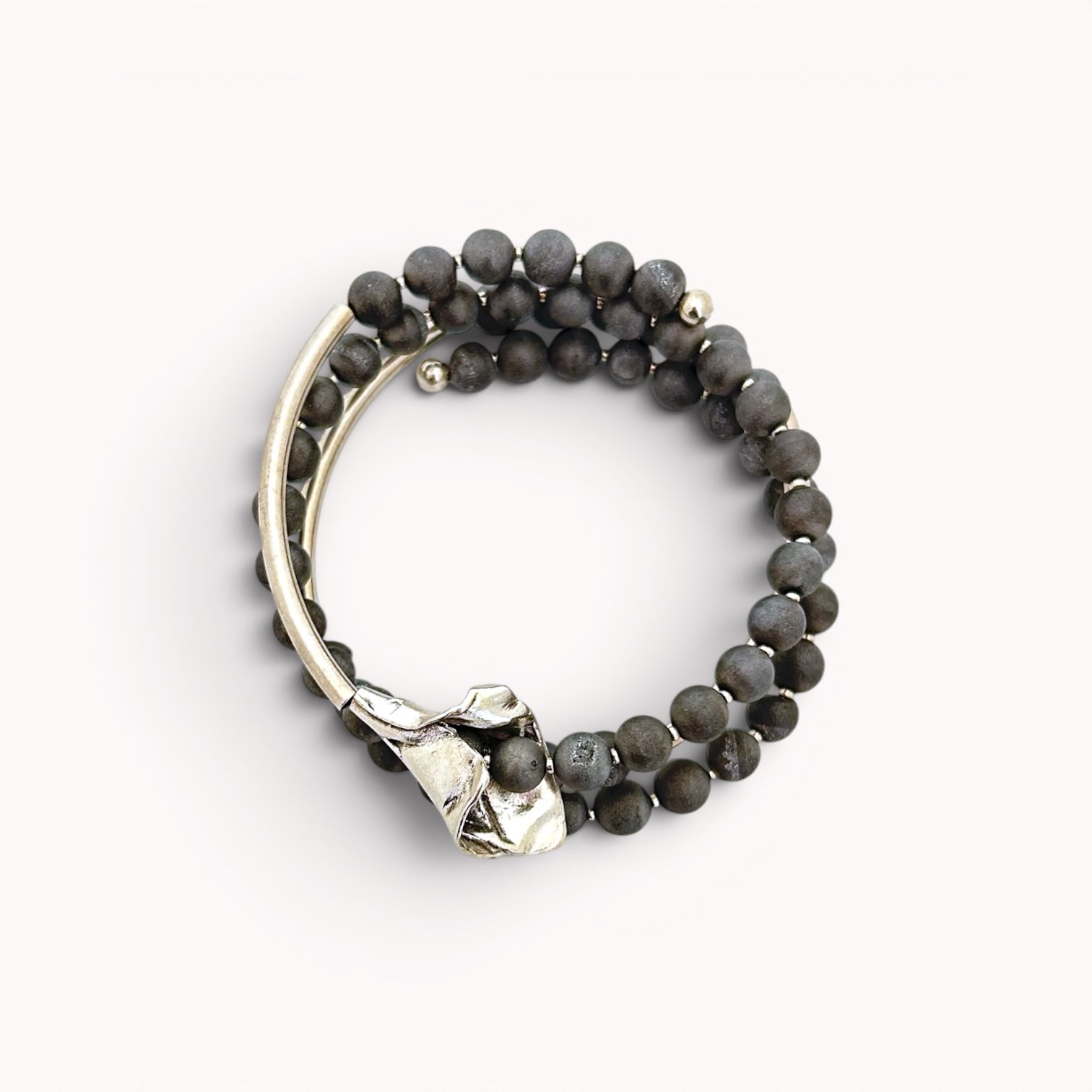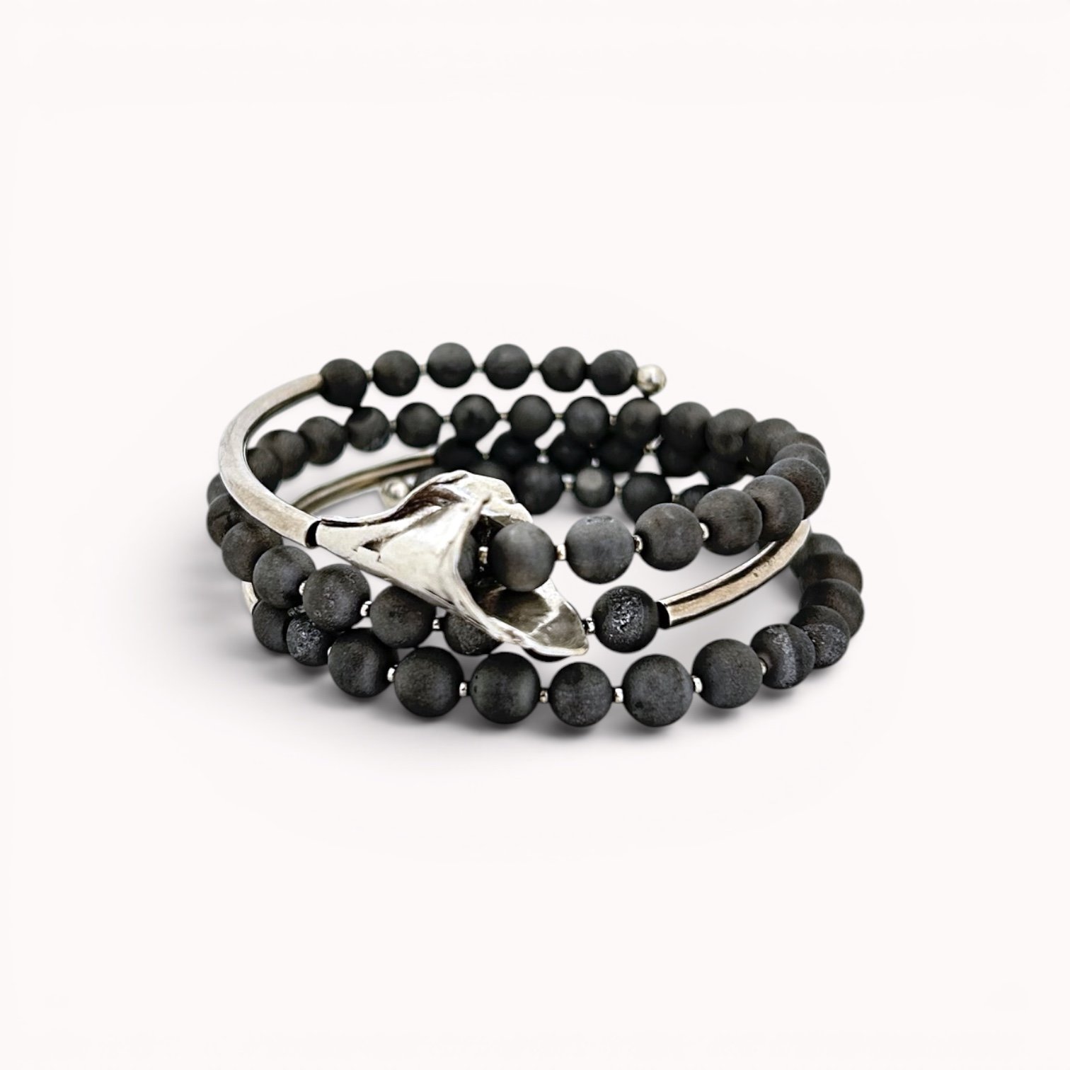 Apgaubkite savo riešą elegancija su šia nuostabia 3 sluoksnių apyranke. Pilkas agatas bei sidabruoti akcentai suteikia žavesio ir rafinuotumo. Suverta ant plieninės vielos apyrankė išlaiko formą ir papildo jūsų stilių. Lengvai apvyniojama aplink riešą ji sukuria ryškų įspūdį.