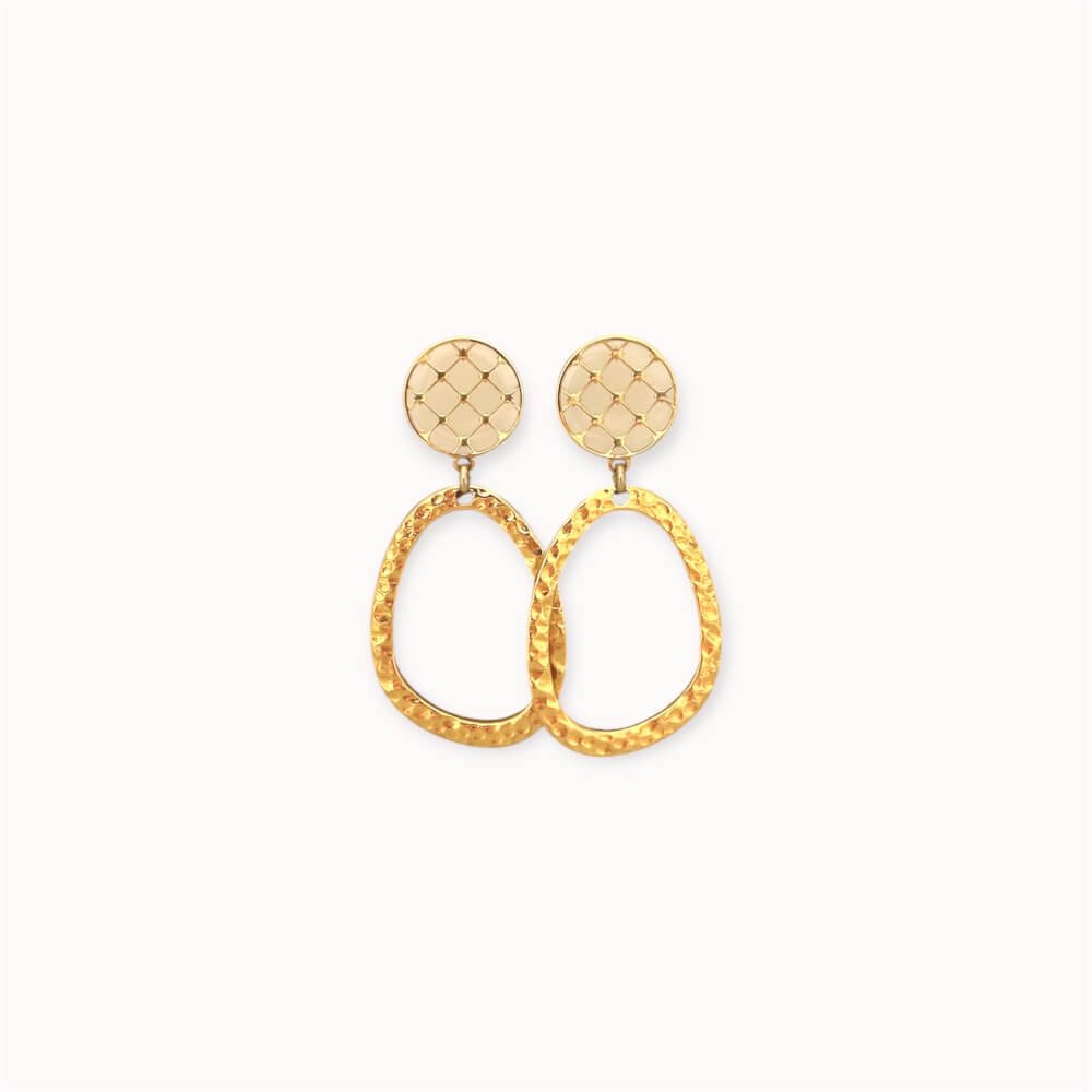 Išraiškingi, bet lengvai derinami auskarai su tekstūruoto paviršiaus detalėmis. Viršutinė emaliuota dalis su subtiliu raštu suteikia struktūros, o netaisyklingos formos kabantys elementai kuria judesį ir šviesos žaismą.