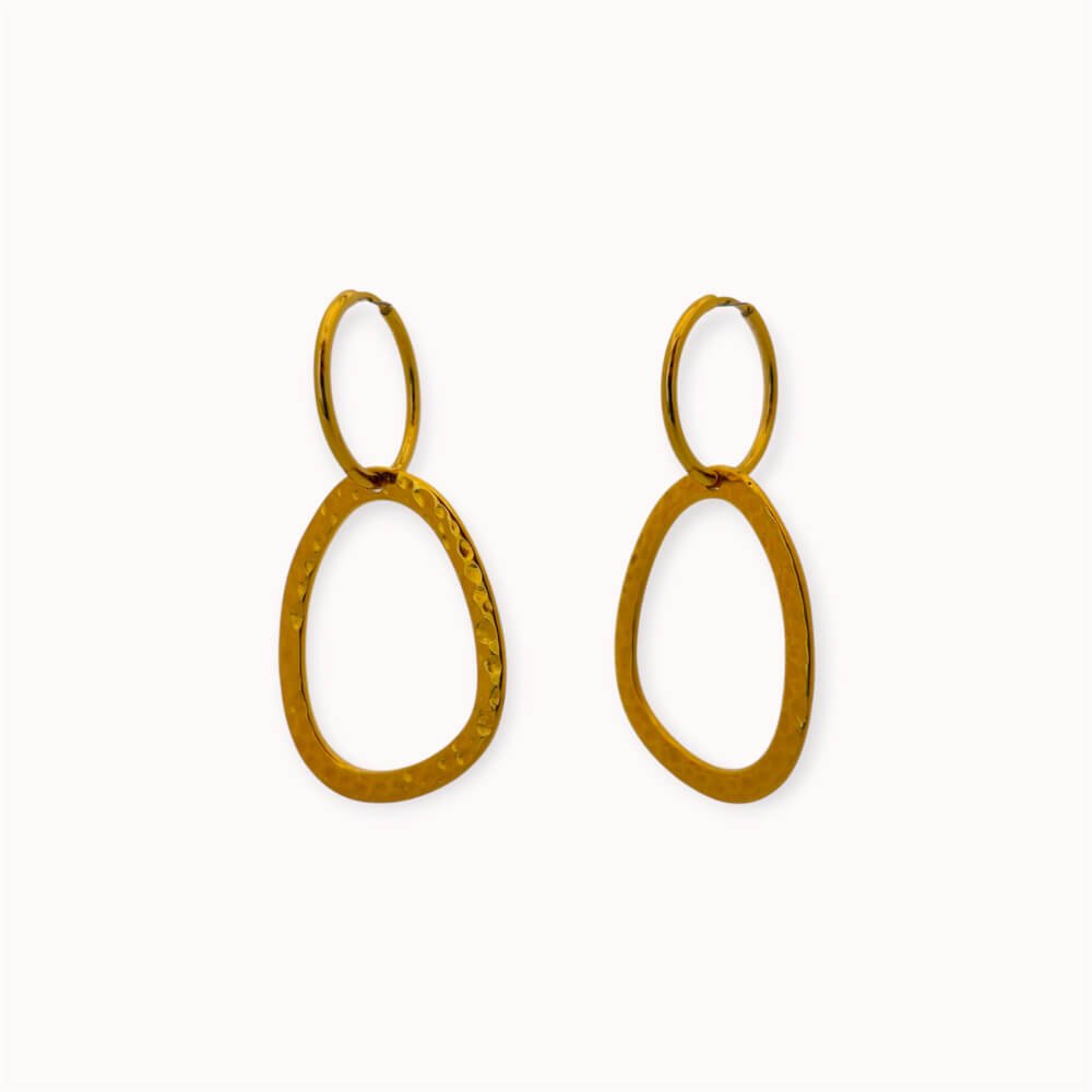 Išraiškingi, bet lengvai derinami auskarai su tekstūruoto paviršiaus detalėmis. Minimalistinės nerūdijančio plieno rinkės suteikia struktūros, o netaisyklingos formos kabantys elementai kuria judesį ir šviesos žaismą.
