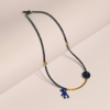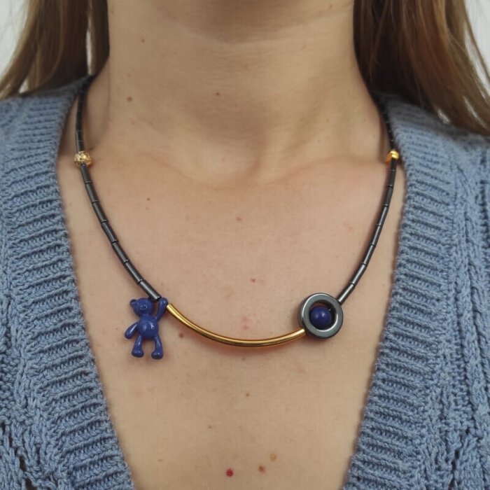 Žaismingas, bet šiuolaikiškas – šis vėrinys suteiks Jūsų įvaizdžiui žavesio ir džiaugsmo. Pagamintas iš hematito karoliukų, auksuoto žalvario detalių ir mielo mėlyno meškiuko pakabuko, jis subtilus, bet turi šelmiškumo. 50 cm ilgio su papildoma 4 cm grandinėle šis papuošalas papildys jūsų kolekciją universalumu ir galimybe derint su kitais papuošalais.