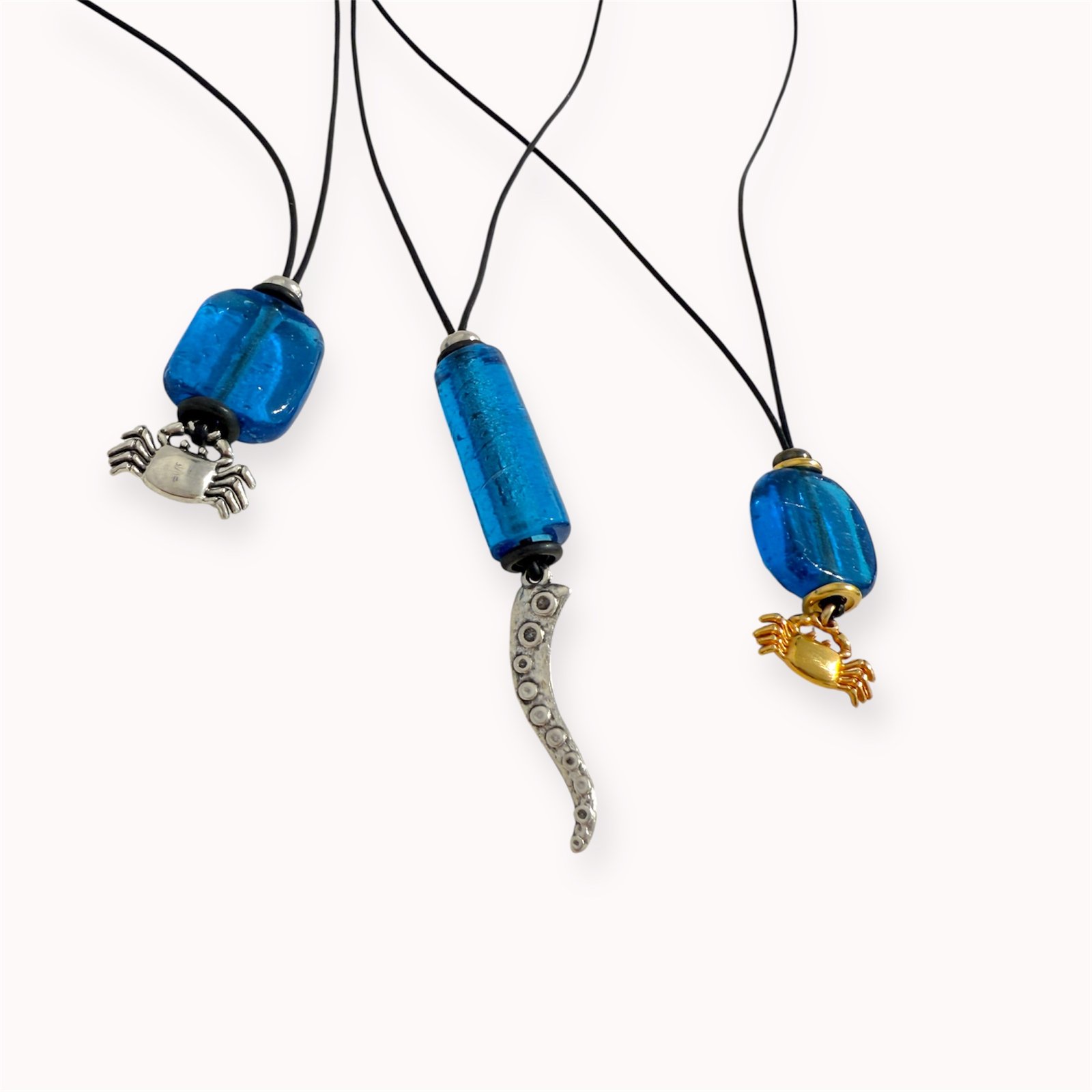 Pakabukai su mėlynu indišku stiklu, įkvėpti jūros motyvų. Sodri, vandens gelmę primenanti spalva dera su pakabukais – krabu arba aštuonkojo koja – suteikiančiomis papuošalui žaismingo, bei stilingo charakterio.