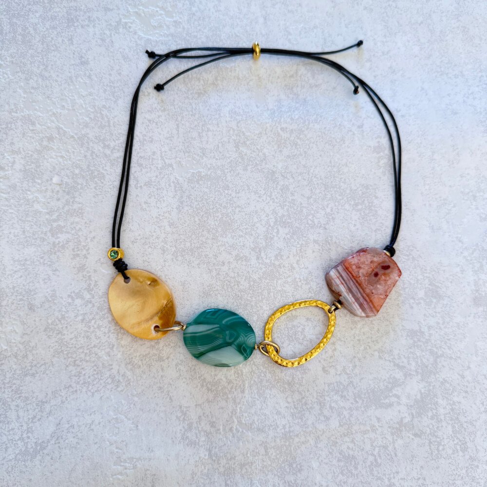 Drąsus, bet lengvai derinamas vėrinys, kuriame susipina žemės tonai ir subtilus kontrastas. Agato, jaspio ir kriauklės akmenys sujungti auksu dengta detale, o natūralios odos virvelė su slankiojančiu užsegimu suteikia lengvumo ir patogumo. Kiekvienas elementas – tarsi gamtos prisilietimas, kuriantis išskirtinį, organišką įvaizdį.