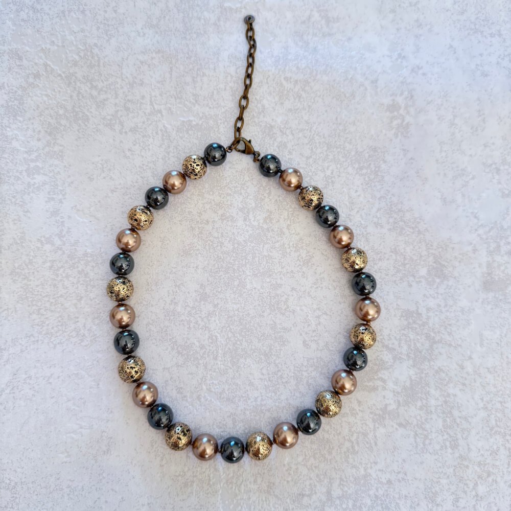 Elegantiškas ir išraiškingas vėrinys, kuriame dera hematitas, auksu dengta lava ir Swarovski perlai. Derinys, kuris spindi subtiliai – ne per daug, bet tiek, kiek reikia, kad atrodytum išskirtinai. Klasikiniai atspalviai ir metalinis žvilgesys kuria modernų, bet laiko nepavaldų įvaizdį.