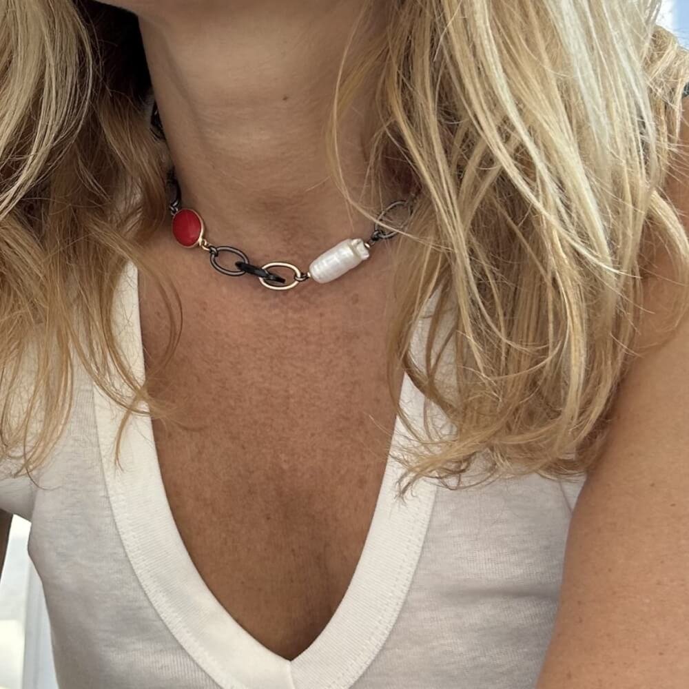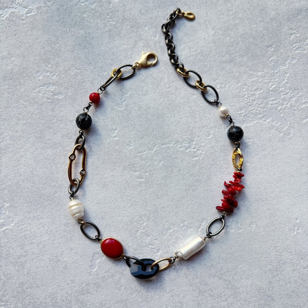 Ryškus, bet elegantiškas – šis vėrinys alsuoja spalvomis ir charakteriu. Auksu ir juodintu metalu dengta grandinėlė derinama su natūraliais akmenimis – marmuru, natūraliais upiniais perlais, koralu ir Swarovski kristalais – suteikia papuošalui žaismingumo ir unikalumo. Pagrindinis ilgis – 42 cm, bet su papildoma 6 cm grandinėle jį lengvai pritaikysit pagal savo stilių – nešiokite arčiau kaklo arba laisviau. Tobulas akcentas saulėtoms dienoms arba norint įnešti gyvybės aprangai.