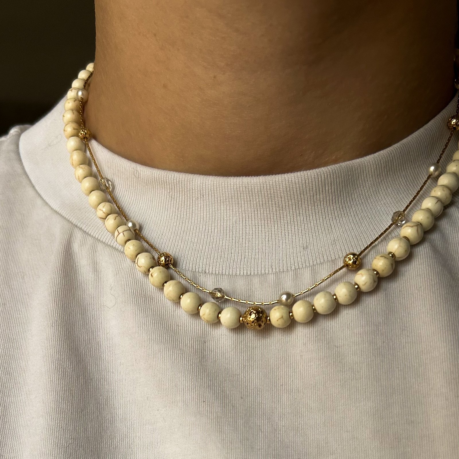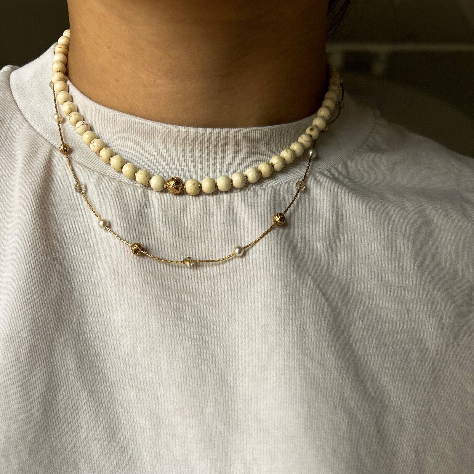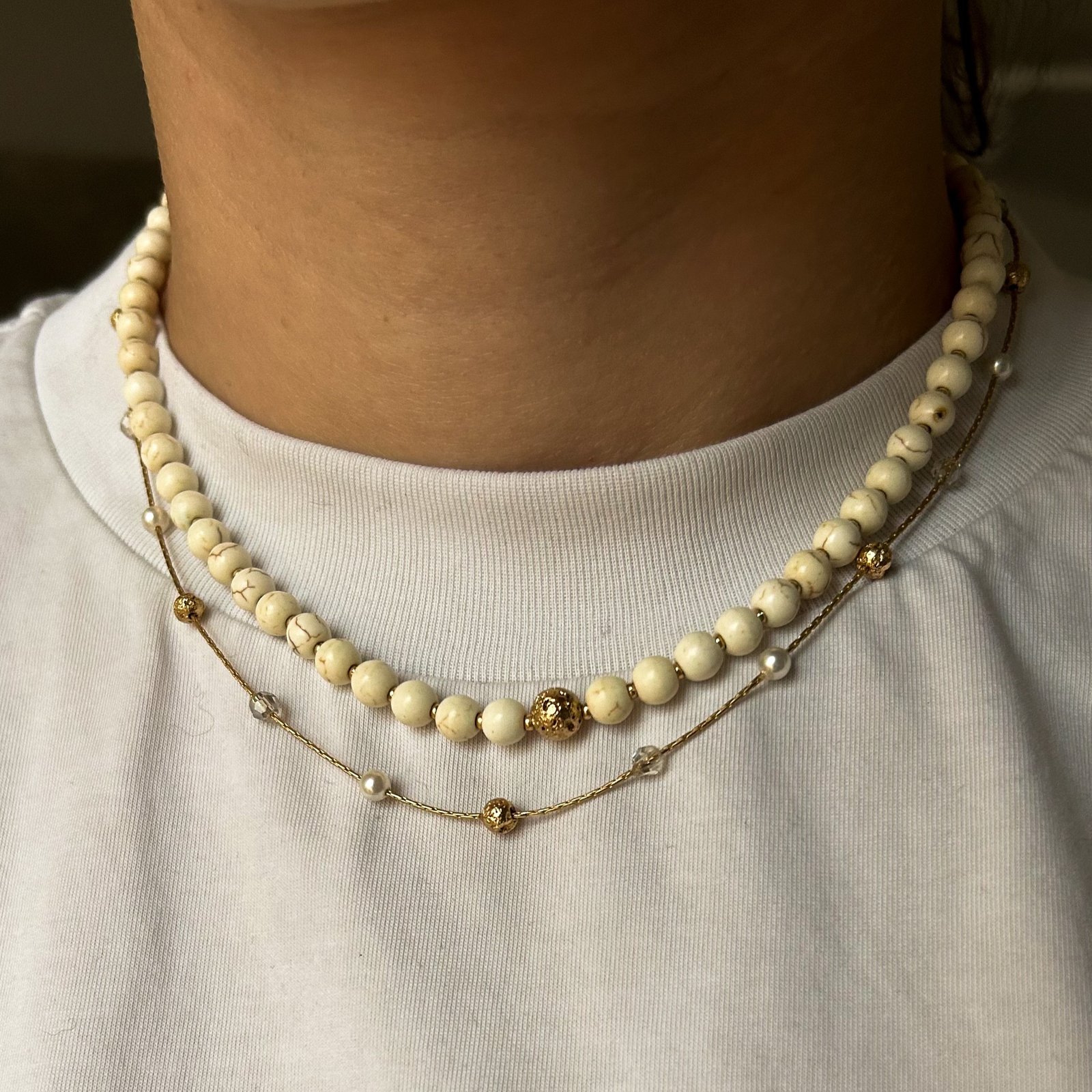 Šiame elegantiškame dviejų vėrinių rinkinyje rasite hovlito vėrinį su akcentiniu lavos karoliuku ir minimalistinį Swarovski kristalų, perlų ir lavos vėrinį įnešantį rafinuoto blizgesio. Ramius ir šviesius hovlito tonus papildo auksuoti akcentai.
