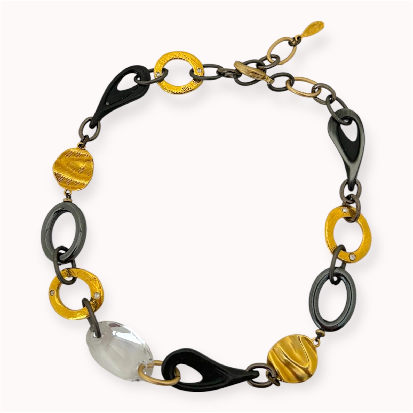 Modernus vėrinys su Swarovski kristalu ir hematitu – subtilus, bet išraiškingas stiliaus akcentas. Skirtingų formų metalinės jungtys kuria šiuolaikišką, dinamišką dizainą, o skaidrus Swarovski kristalas suteikia lengvo spindesio ir elegancijos. Puikiai tinka tiek kasdieniam įvaizdžiui, tiek ypatingoms progoms.