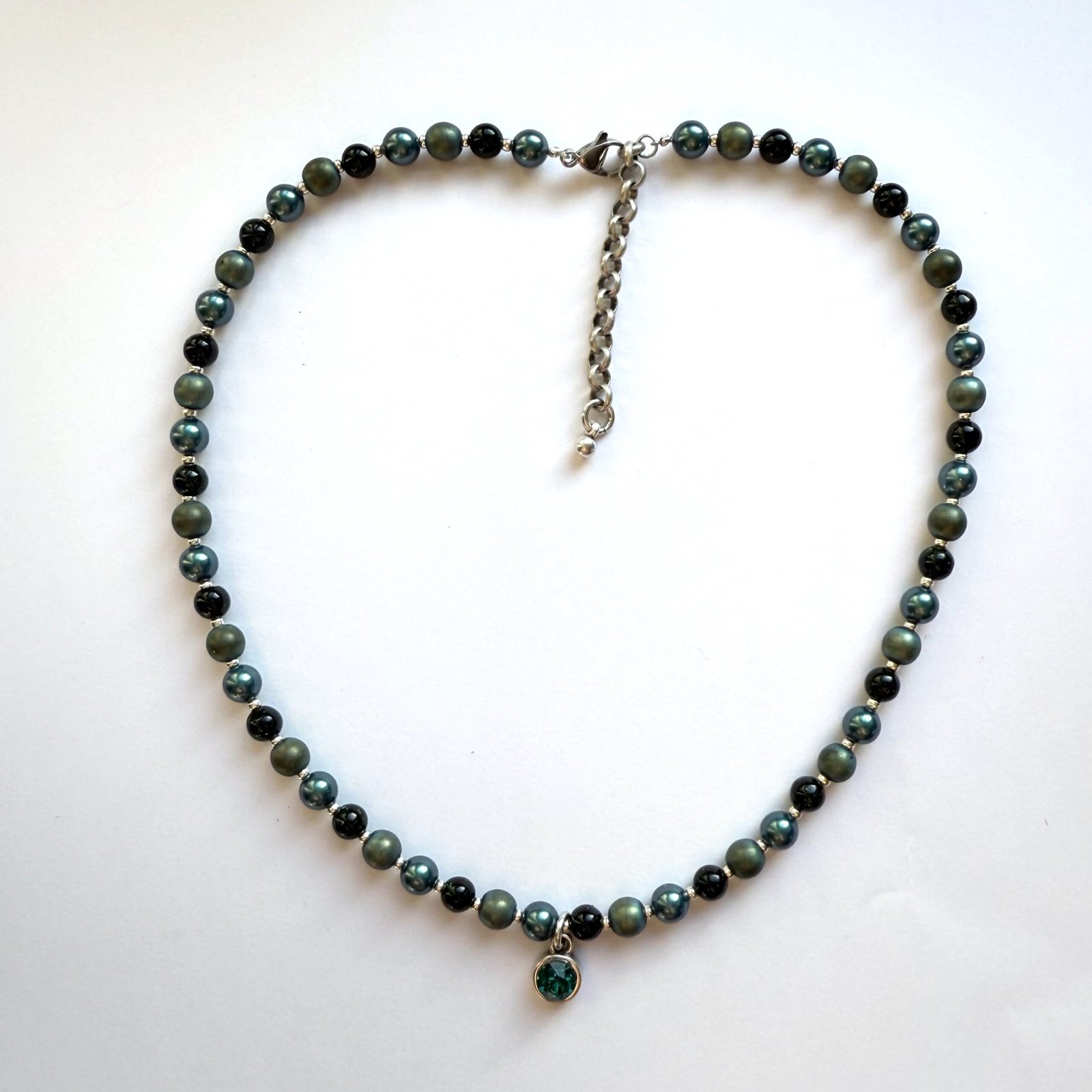 Minimalistinis vėrinys iš hematito, juodo onikso ir Swarovski perlų. Subtilus žalio Swarovski kristalo pakabukas suteikia kompozicijai išskirtinumo, bet išlaiko švarų, lengvai derinamą siluetą. Skirtingi paviršiai, matiniai ir blizgūs, kuria modernų kontrastą, tinkantį tiek kasdieniam stiliui, tiek ramiam vakaro įvaizdžiui.
