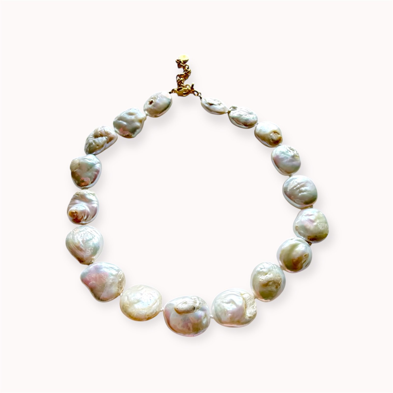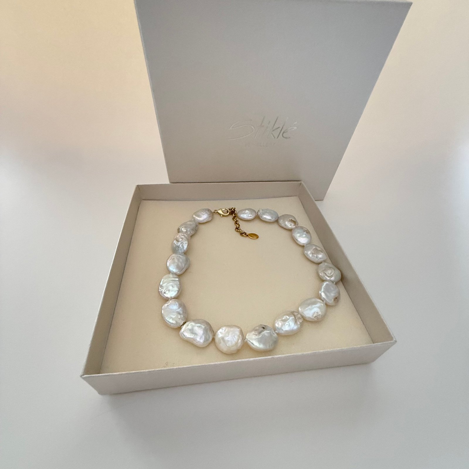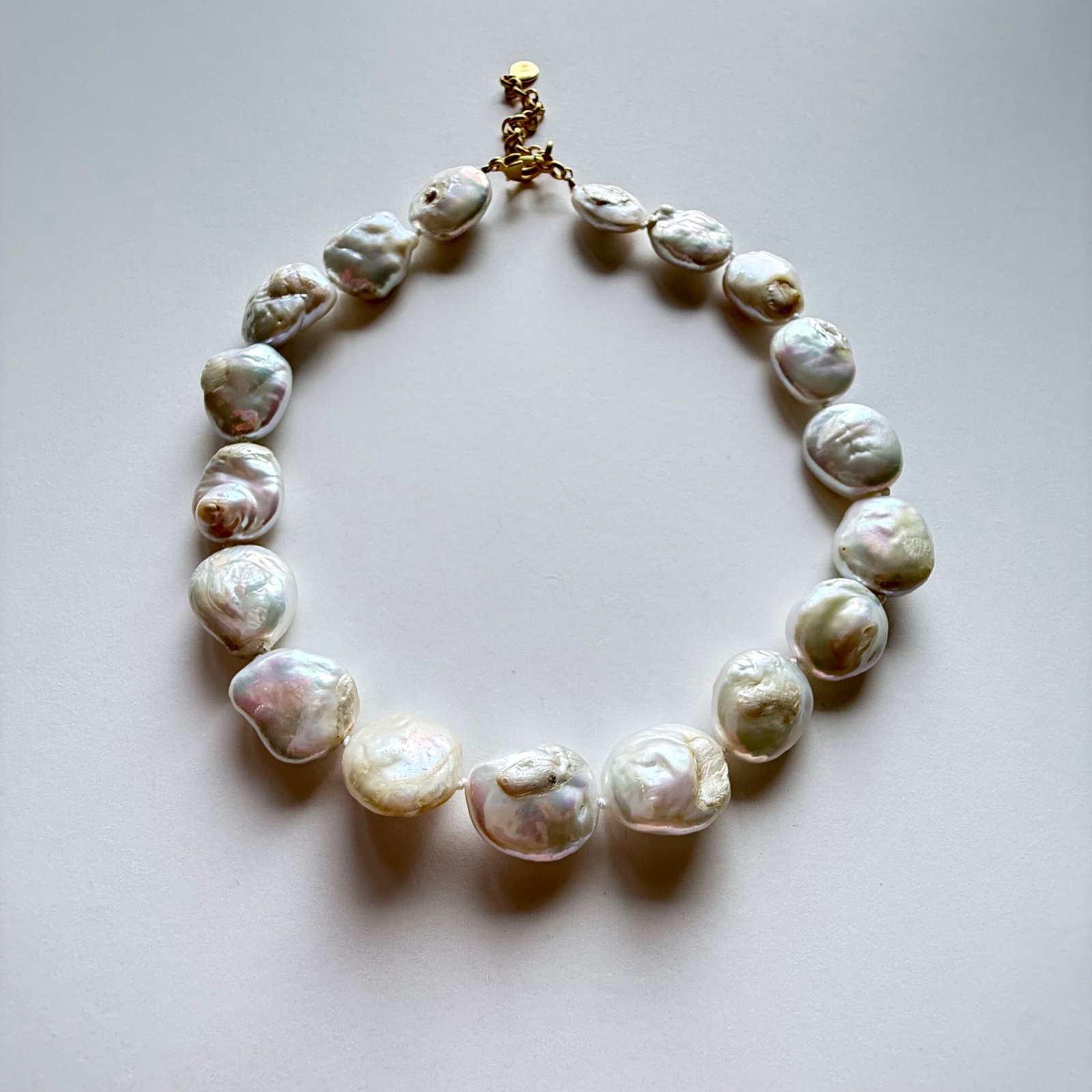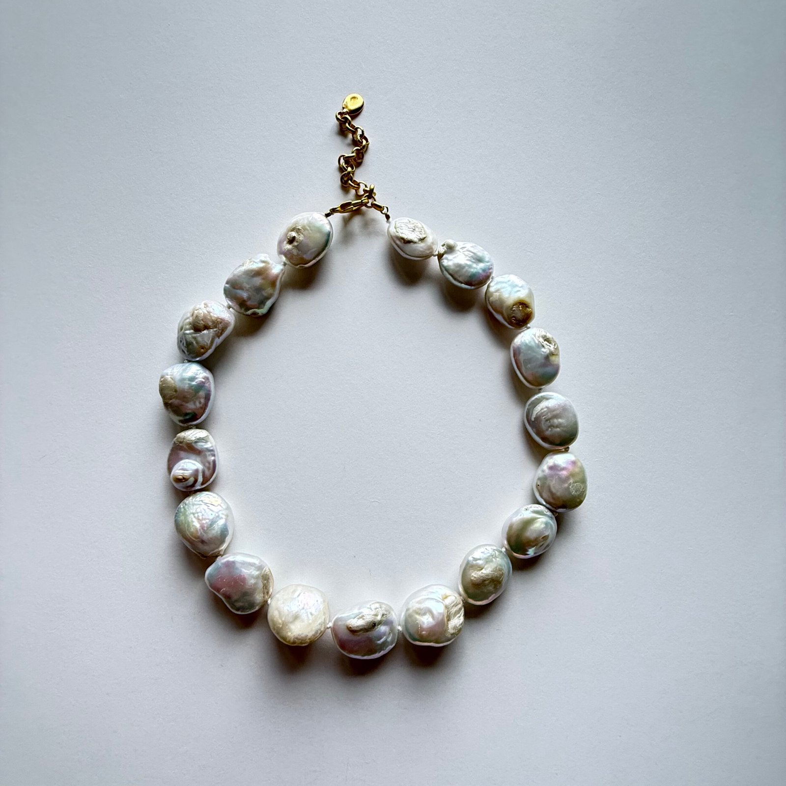 Šis stambus perlų vėrinys sukurtas iš netaisyklingos formos natūralių perlų, kurių paviršius subtiliai žaidžia šviesa. Kiekvienas perlas unikalus, todėl vėrinys atrodo gyvas ir charakteringas.