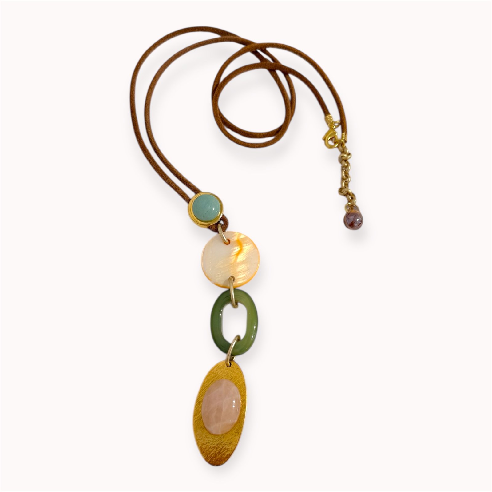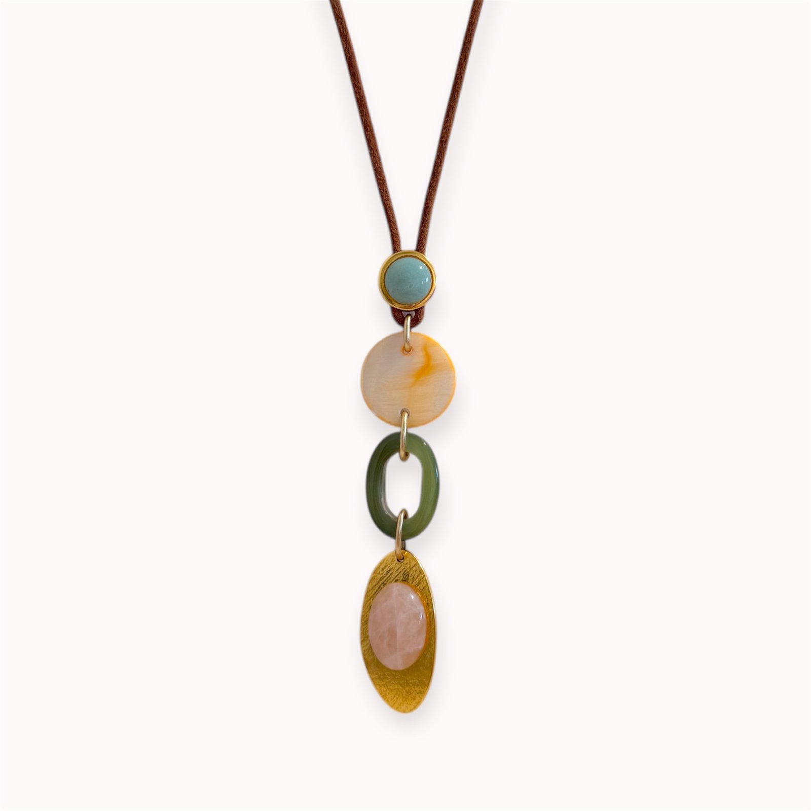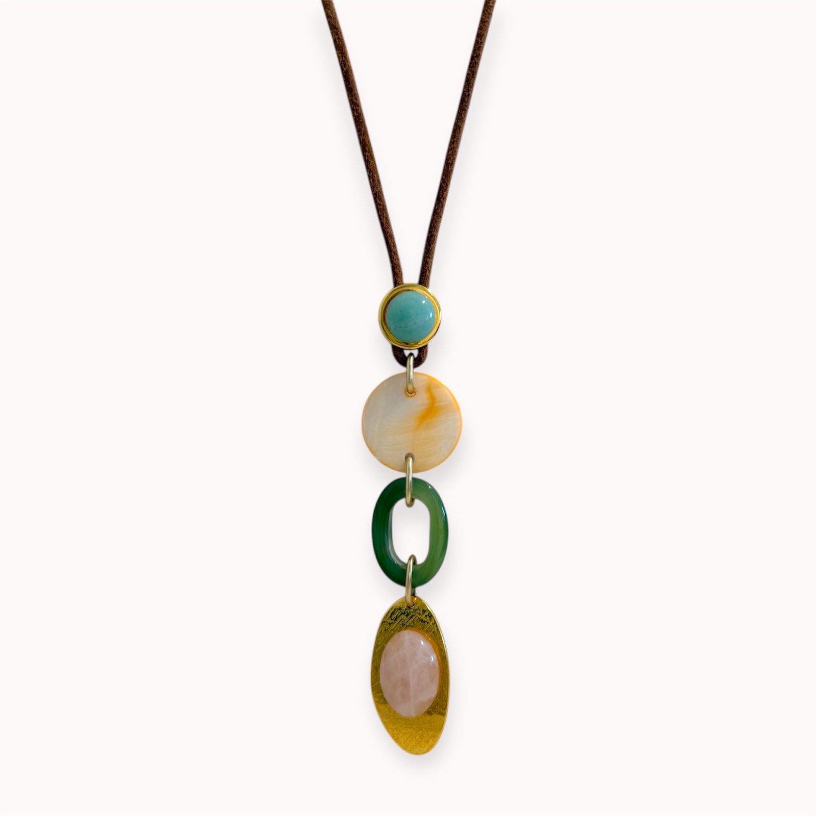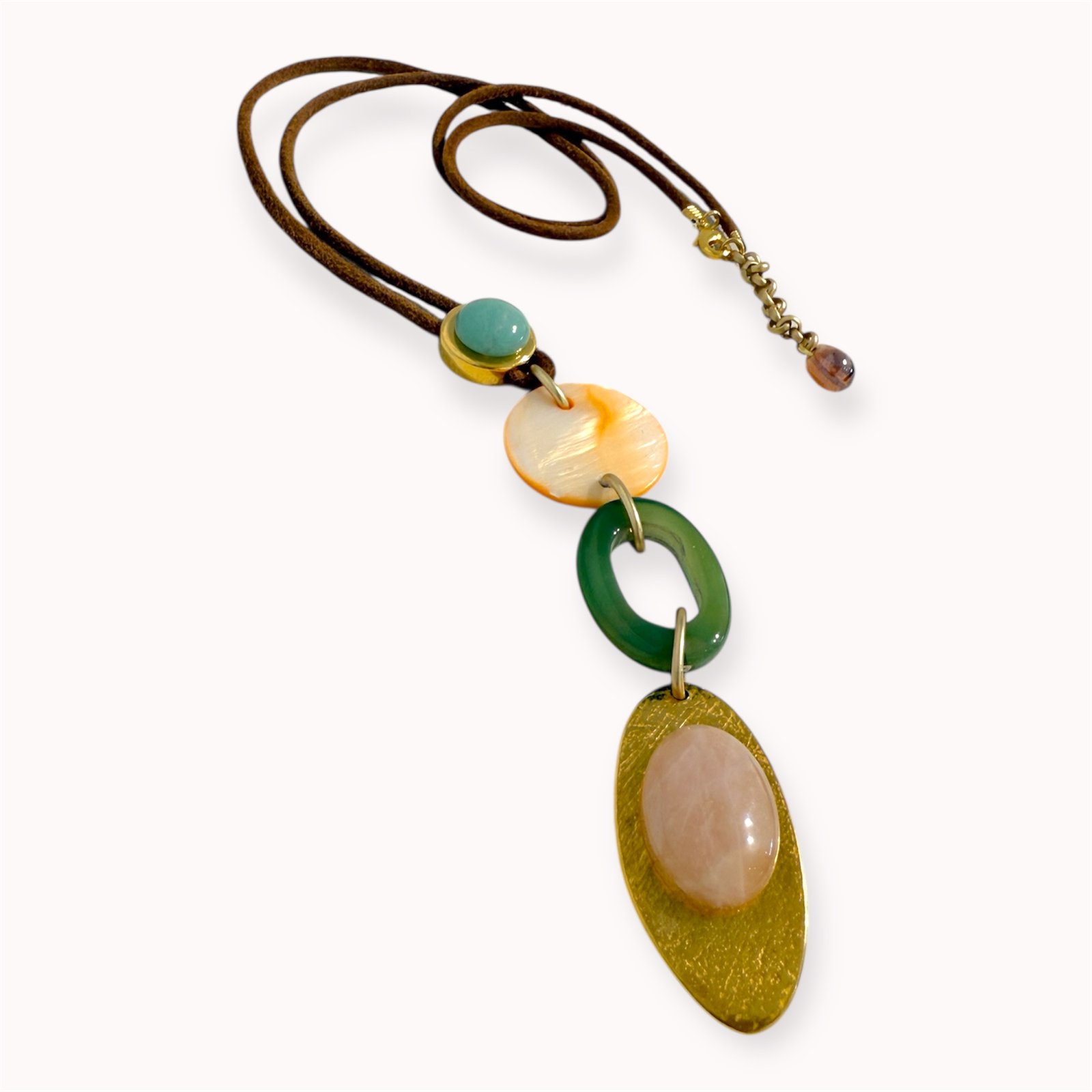 • Avantiūrinas, agatas, rožinis kvarcas, kriauklė, indiškas stiklas