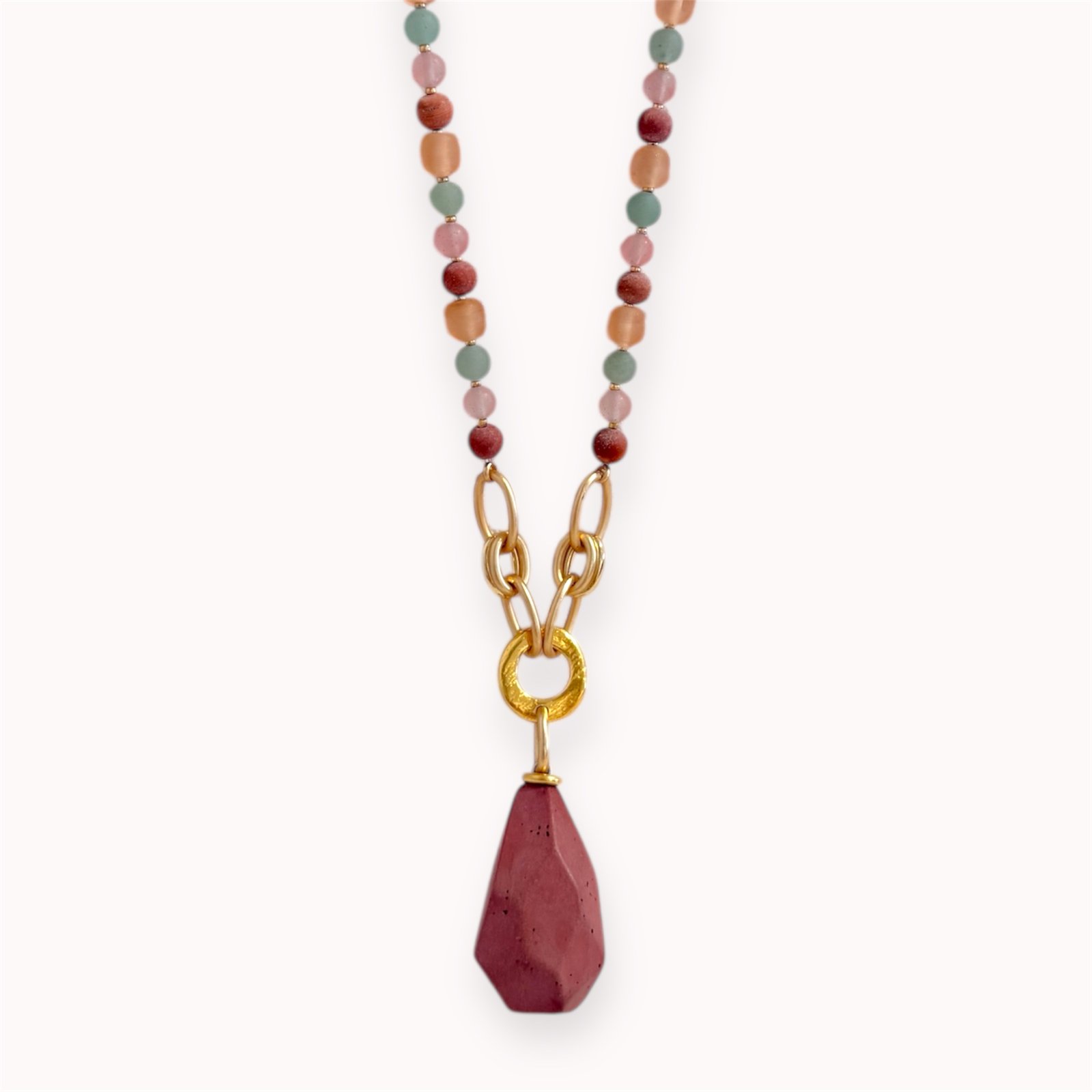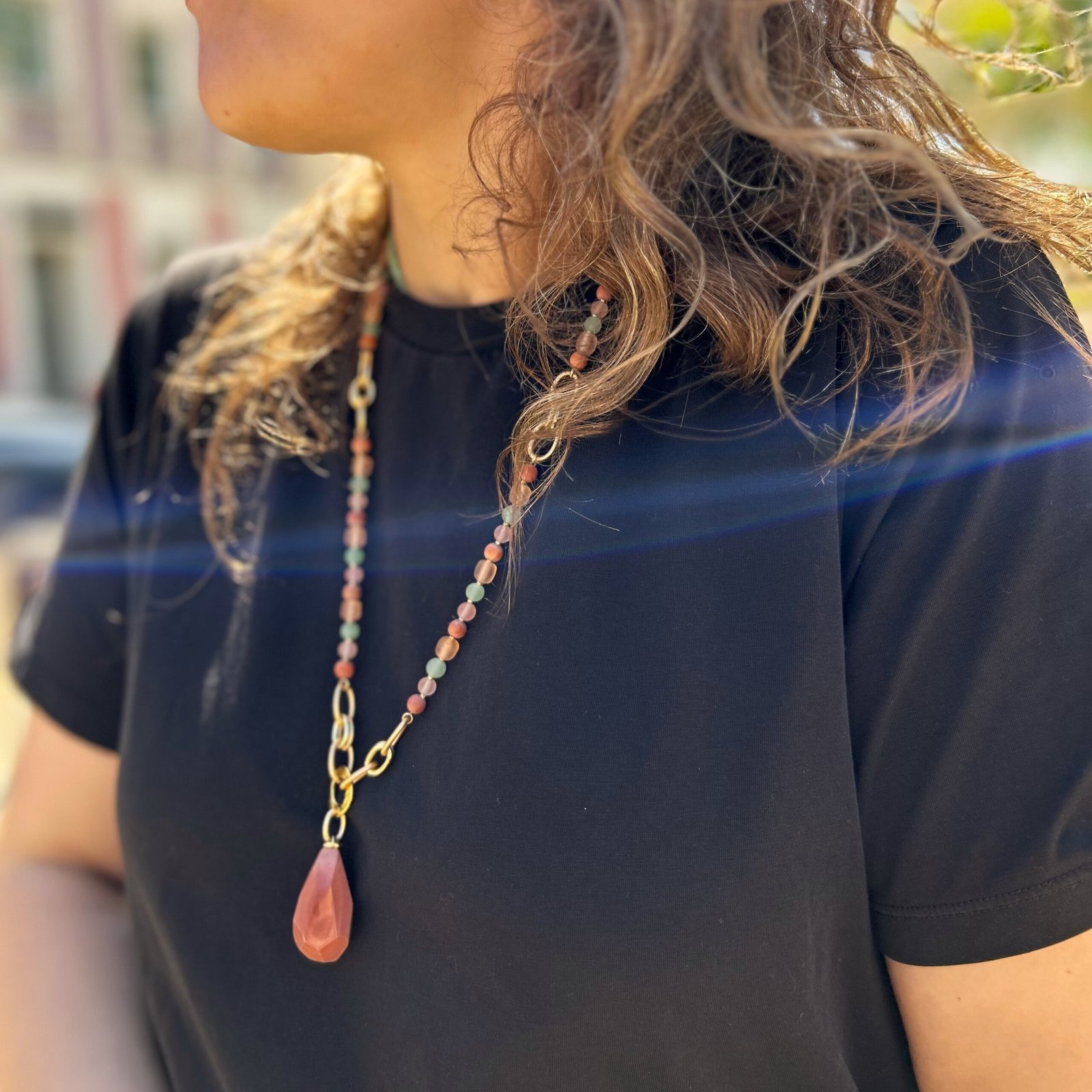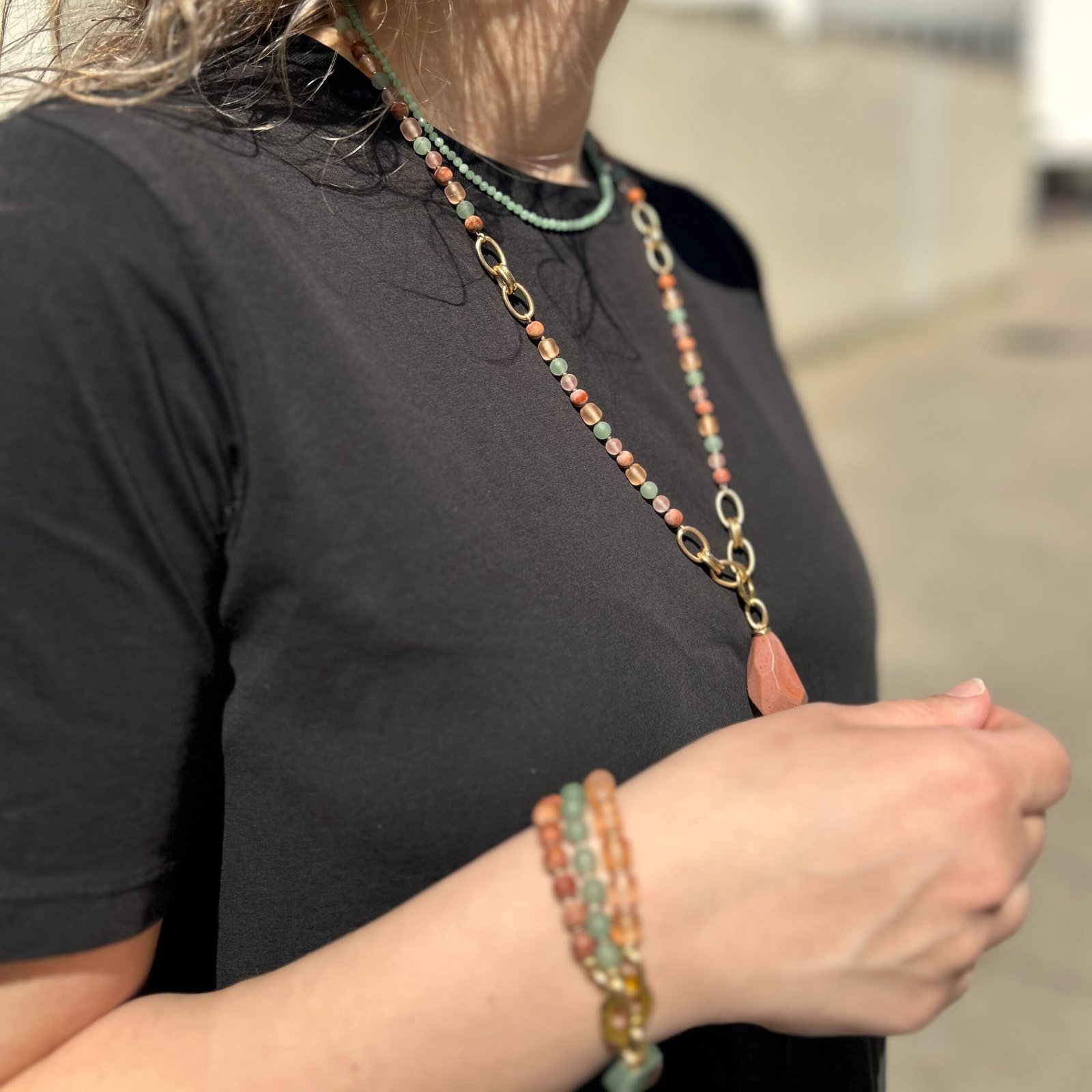 Paprastas, stilingas ir unikalus – šis rankų darbo vėrinys išsiskiria harmoninga Oranžinės, rožinės ir žalios spalvų kombinacija. Paprasti Avantiūrino, agato ir indiško stiklo karoliukai dera su agato pakabuku, kuris suteikia jam išskirtinumo. Tobulas pasirinkimas tiek kasdienai, tiek ypatingoms progoms.