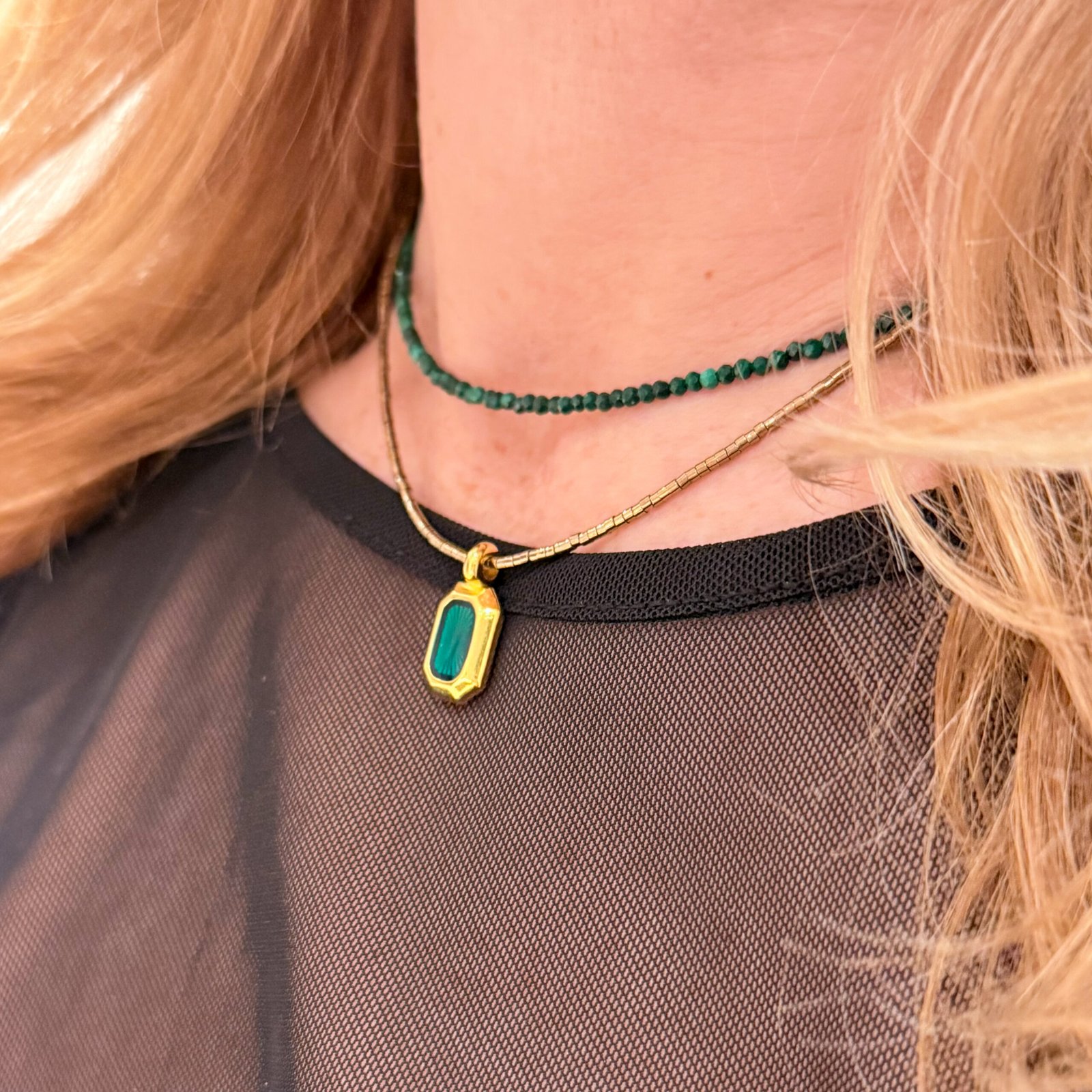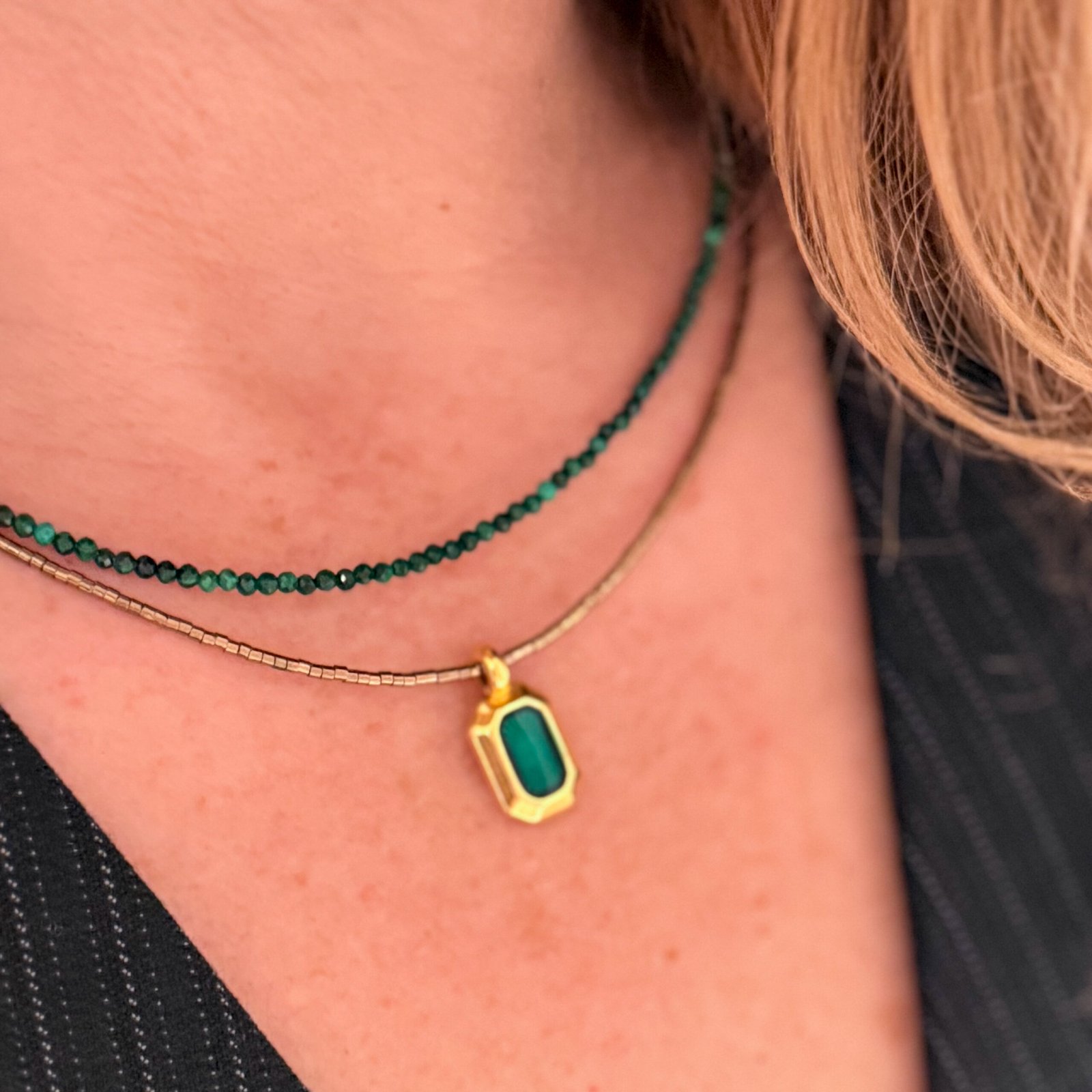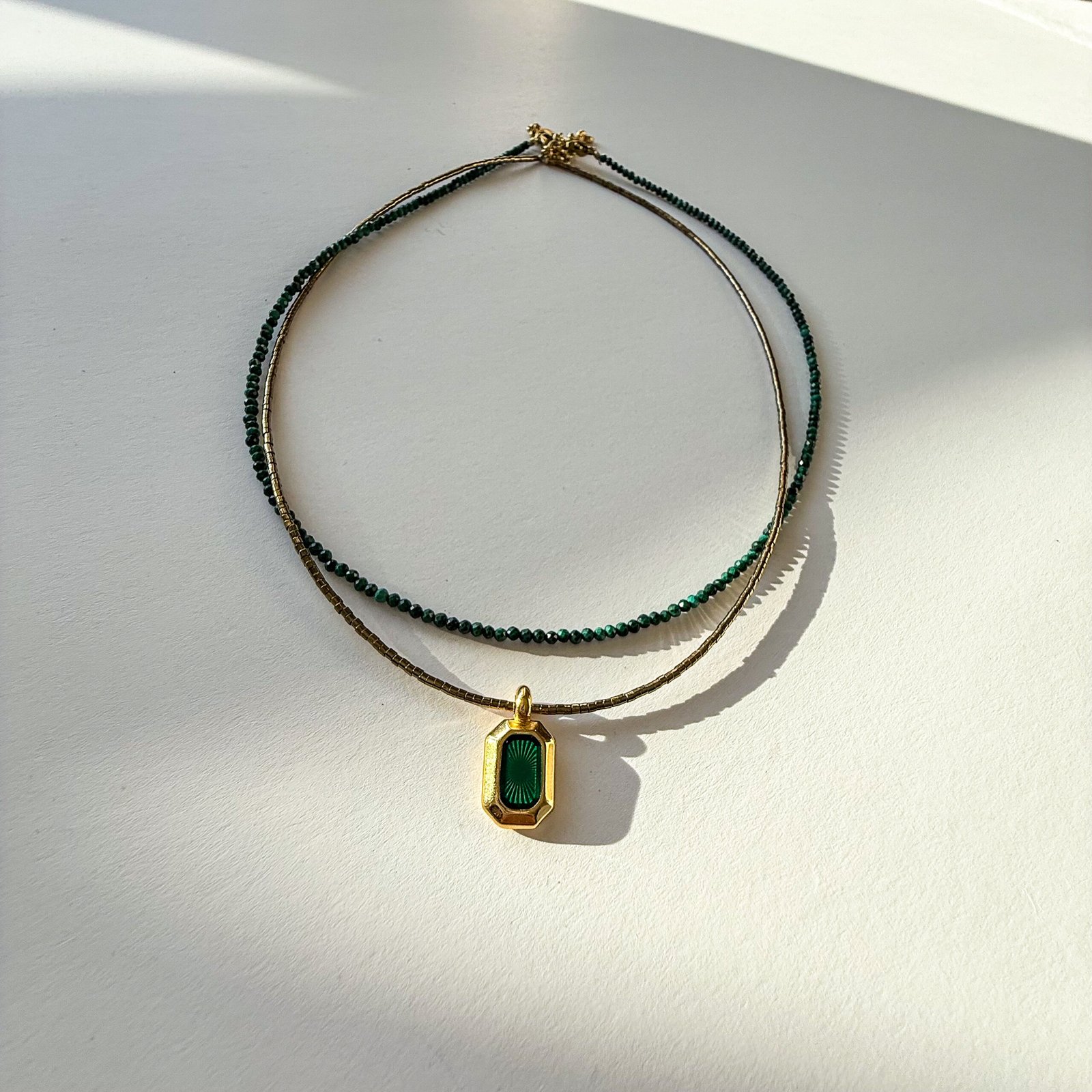 Rafinuotas dviejų vėrinių rinkinys, sukurtas lengvam sluoksniavimui. Rinkinį sudaro subtilus žalio malachito karoliukų vėrinys ir smulkus aukso spalvos hematito vėrinys su auksu dengtu pakabuku su sodriai žaliu emaliuotu akcentu. Natūralaus akmens tekstūros, metalo žvilgesio ir glotnaus emalio kontrastas sukuria modernų, bet laikui nepavaldų įvaizdį. Puikiai tinka nešioti kartu sluoksniuojant arba atskirai – subtiliai elegancijai.