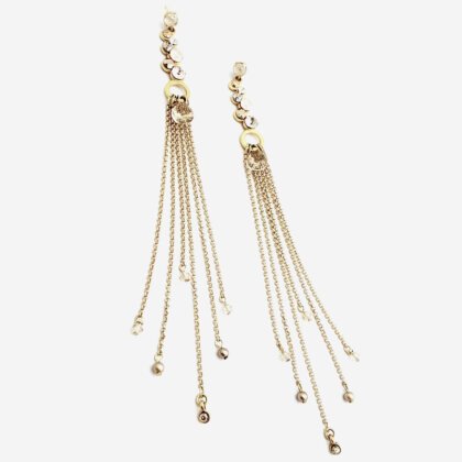 Kai norisi tikro spindesio. Šie 10 cm ilgio auskarai su žėrinčiais Swarovski kristalais šviesoje sužiba su kiekvienu judesiu. Lengvai krintantys nuo plonos, lenktos auksu dengtos detalės, jie kuria elegantišką, bet modernų įvaizdį. Puikus pasirinkimas vakarui, šventei ar tiesiog ypatingai nuotaikai.
