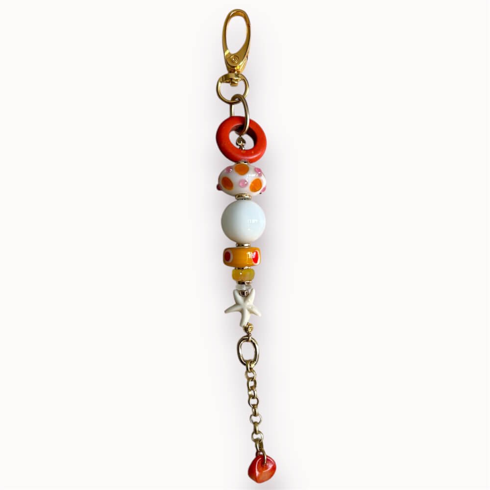 Žaismingos spalvos ir natūralūs akmenys susilieja harmoningai suteikdami jūsų stiliui gaivų, vasarišką pojūtį. Šis akcentas subtiliai praturtina minimalistinį įvaizdį arba atnaujina rankinę, įnešdamas vasariško žavesio. Detalė, kuri patraukia dėmesį, bet išlaiko natūralų elegancijos pojūtį.