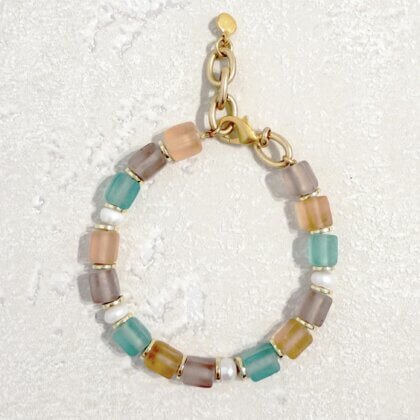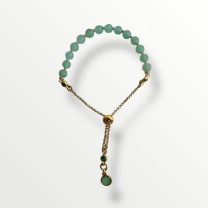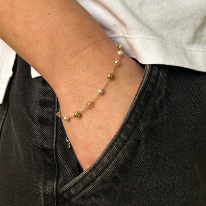 Lengvumas ir žaisminga elegancija viename papuošale. Ši apyrankė suverta iš baltų hovlito karoliukų su jūros žvaigždės akcentu ir auksu dengta žalvario grandinėle. Dėl slankiojančio užsegimo apyrankės dydis universalus ir ją lengva užsidėti.