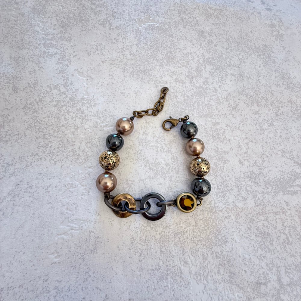 Ruda ir pilka sendintu auksu dengtos lavos, hematito ir Swarovski perlų apyrankė
