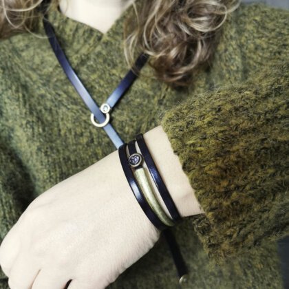Išraiškinga apyrankė, sukurta derinant obsidiano, hovlito ir lavos akmenis. Natūralūs akmenys suteikia papuošalui modernumo ir jėgos, o subtilūs auksuoti akcentai prideda elegancijos. Tai aksesuaras, lengvai pritaikomas tiek kasdieniam įvaizdžiui, tiek ypatingoms progoms.