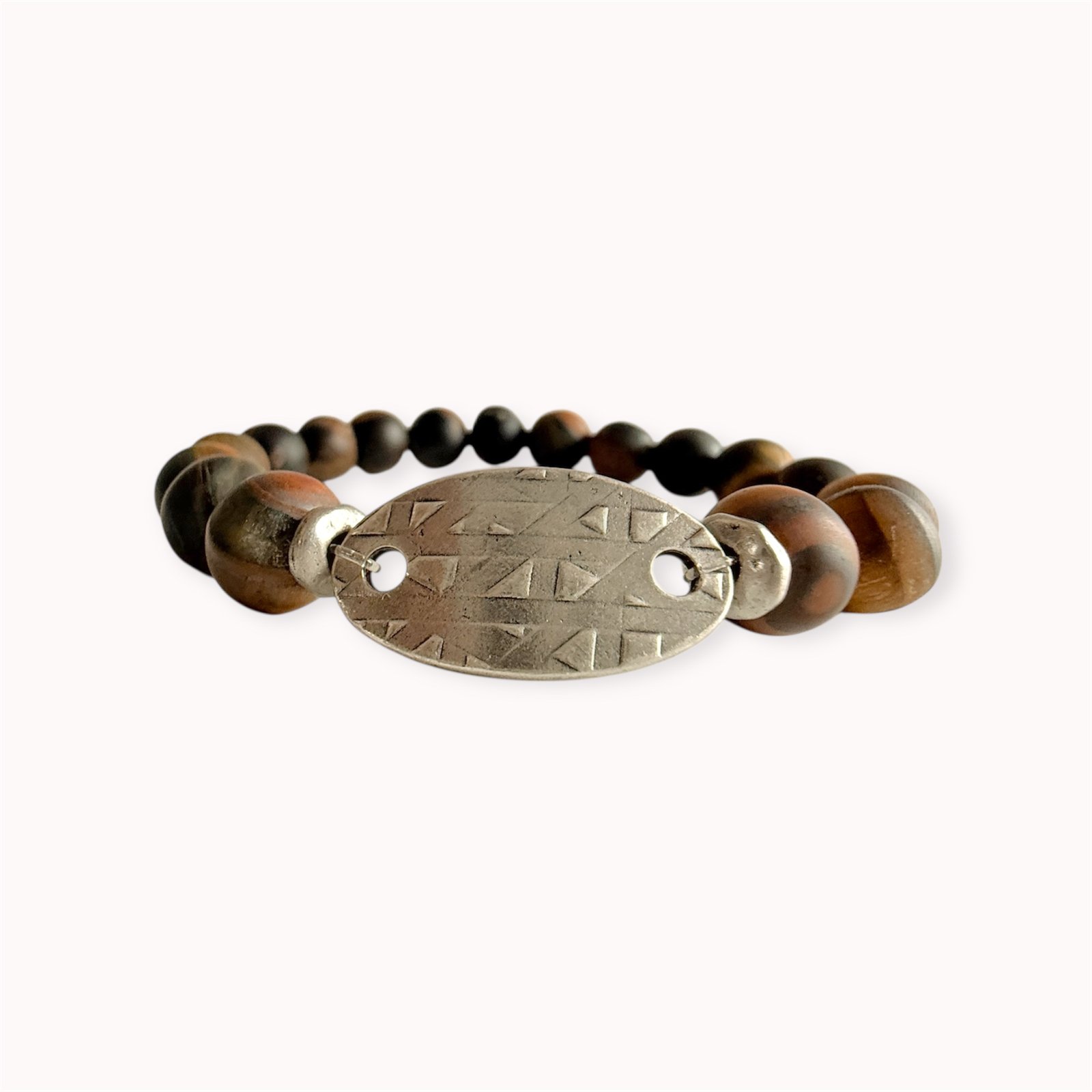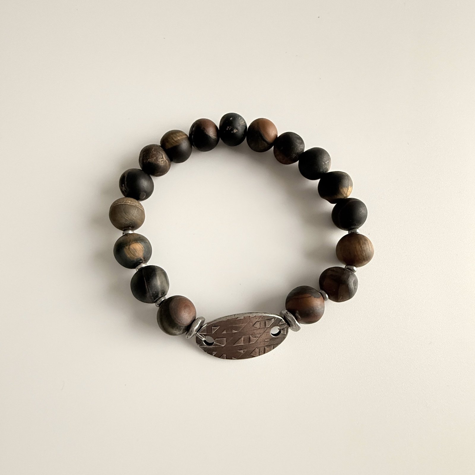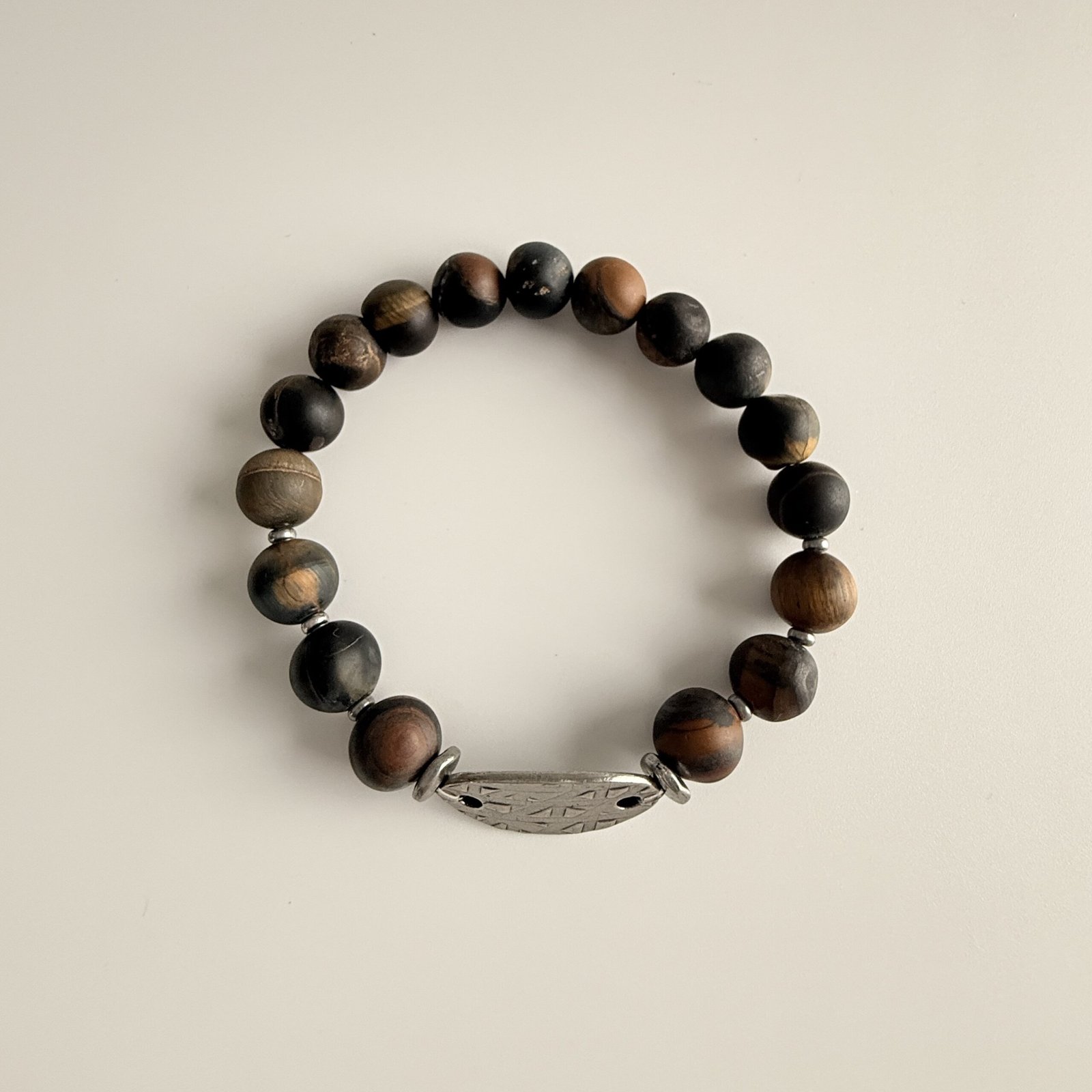 Tvirta ramybė. Laikui nepavaldi estetika. Ši apyrankė sukurta iš matinių tigro akies akmenų, šiltų rudų atspalvių, papildytų sendintu sidabru dengta faktūrine metaline detale. Matinis paviršius suteikia natūralumo pojūtį, o metalinis akcentas – modernų, vyrišką charakterį.