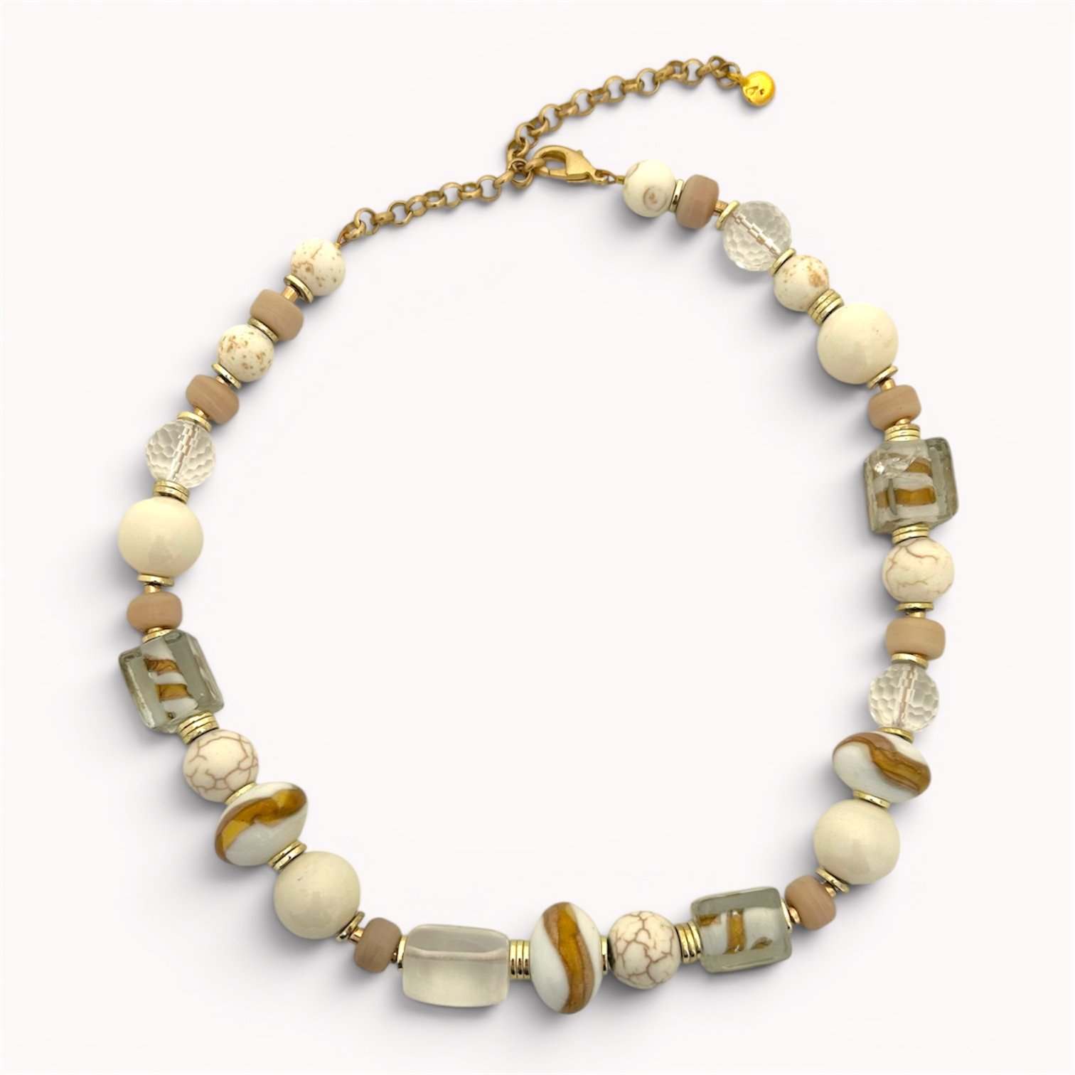A modern necklace where contrasting textures and subtle brown and white color accents come together. The combination of jadeite, indian glass, howlite and ceramics creates a distinctive yet balanced composition.