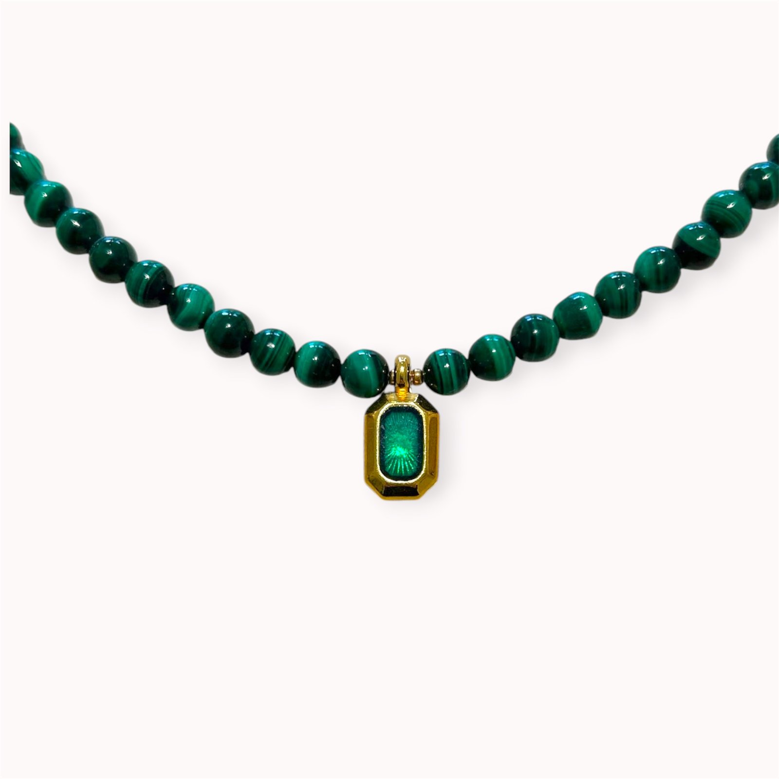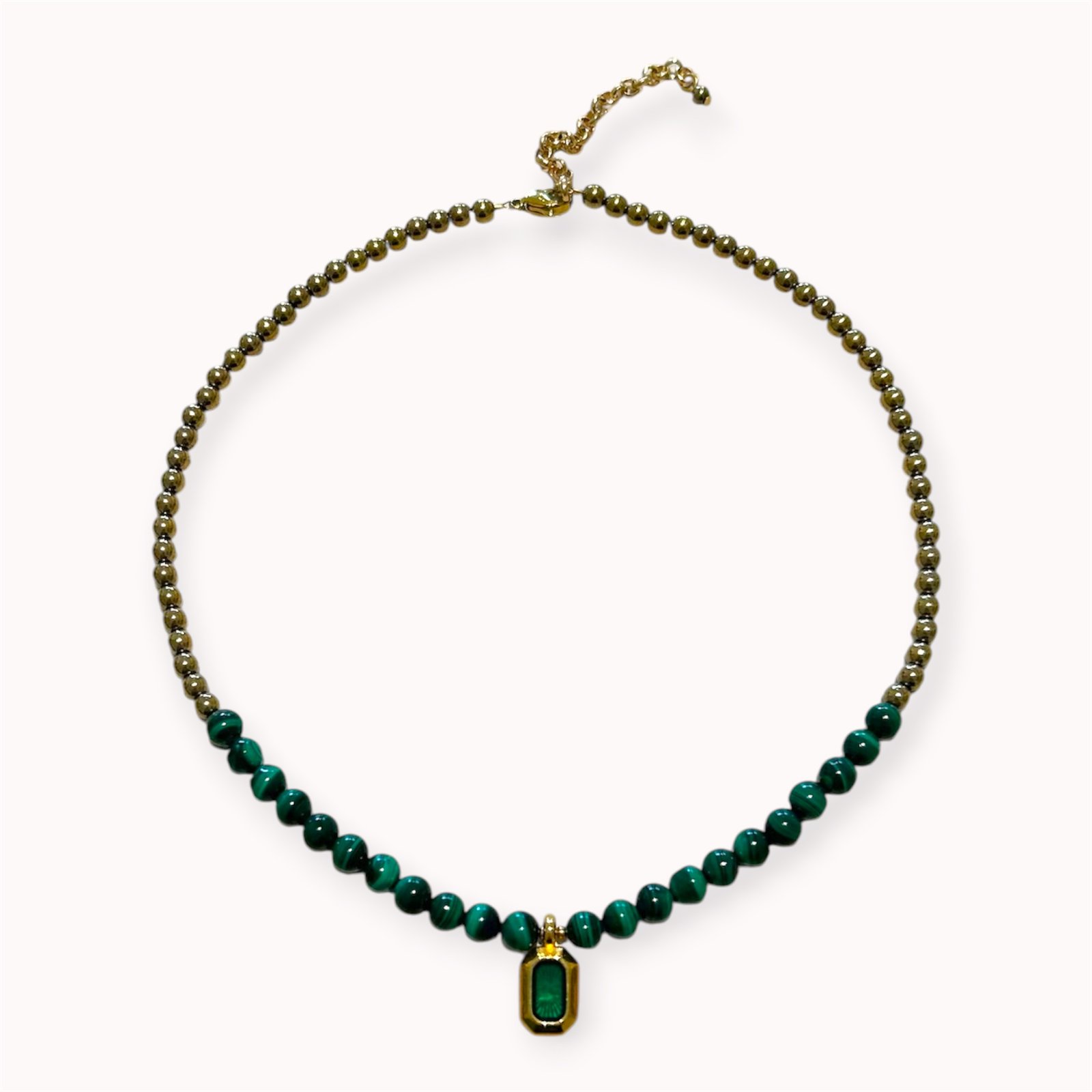 Minimalistic malachite and hematite necklace with enamelled pendant
