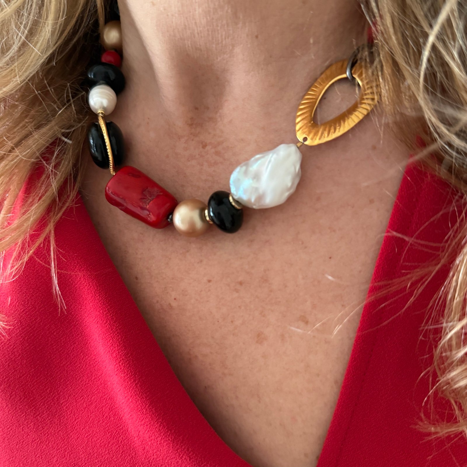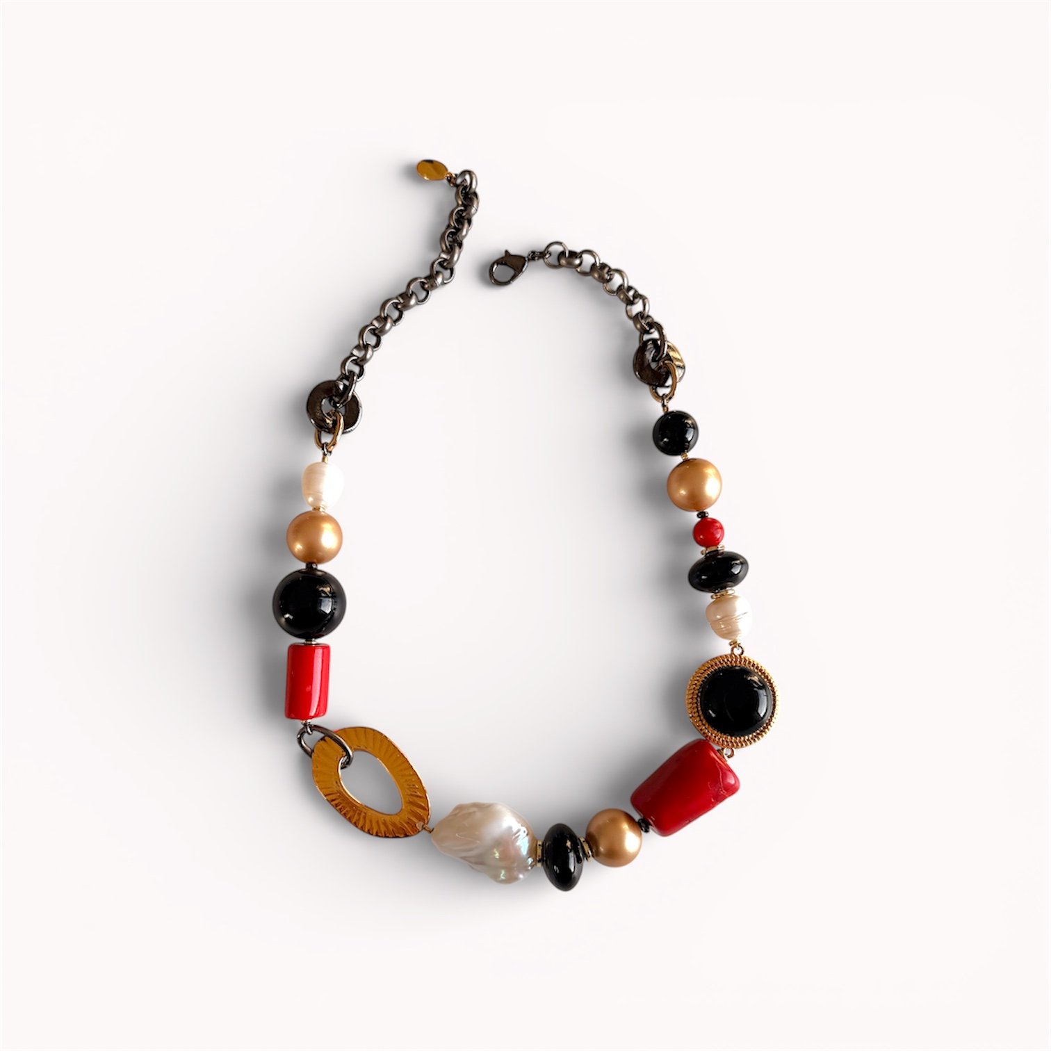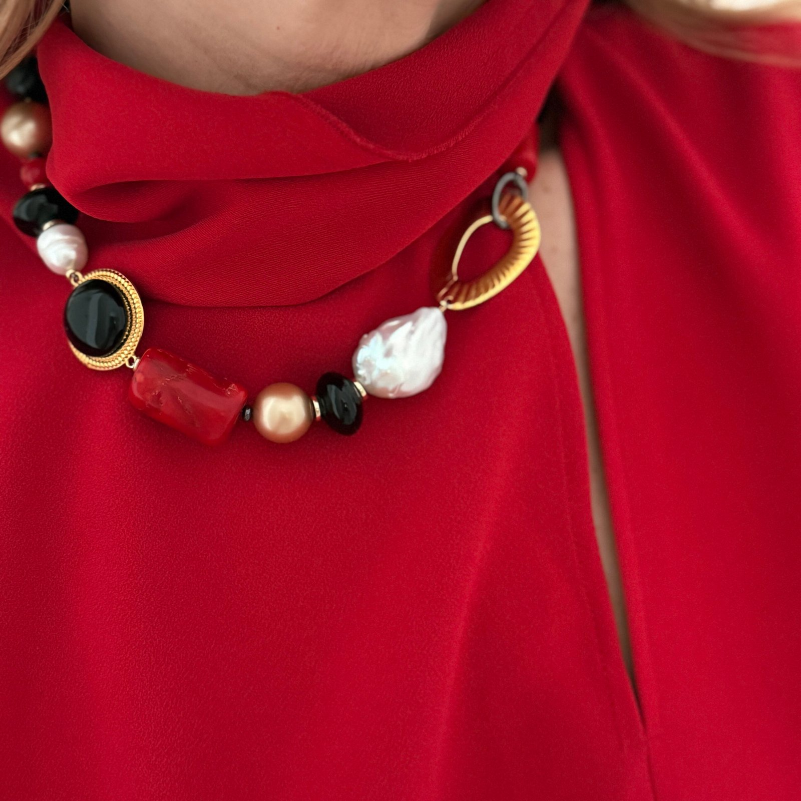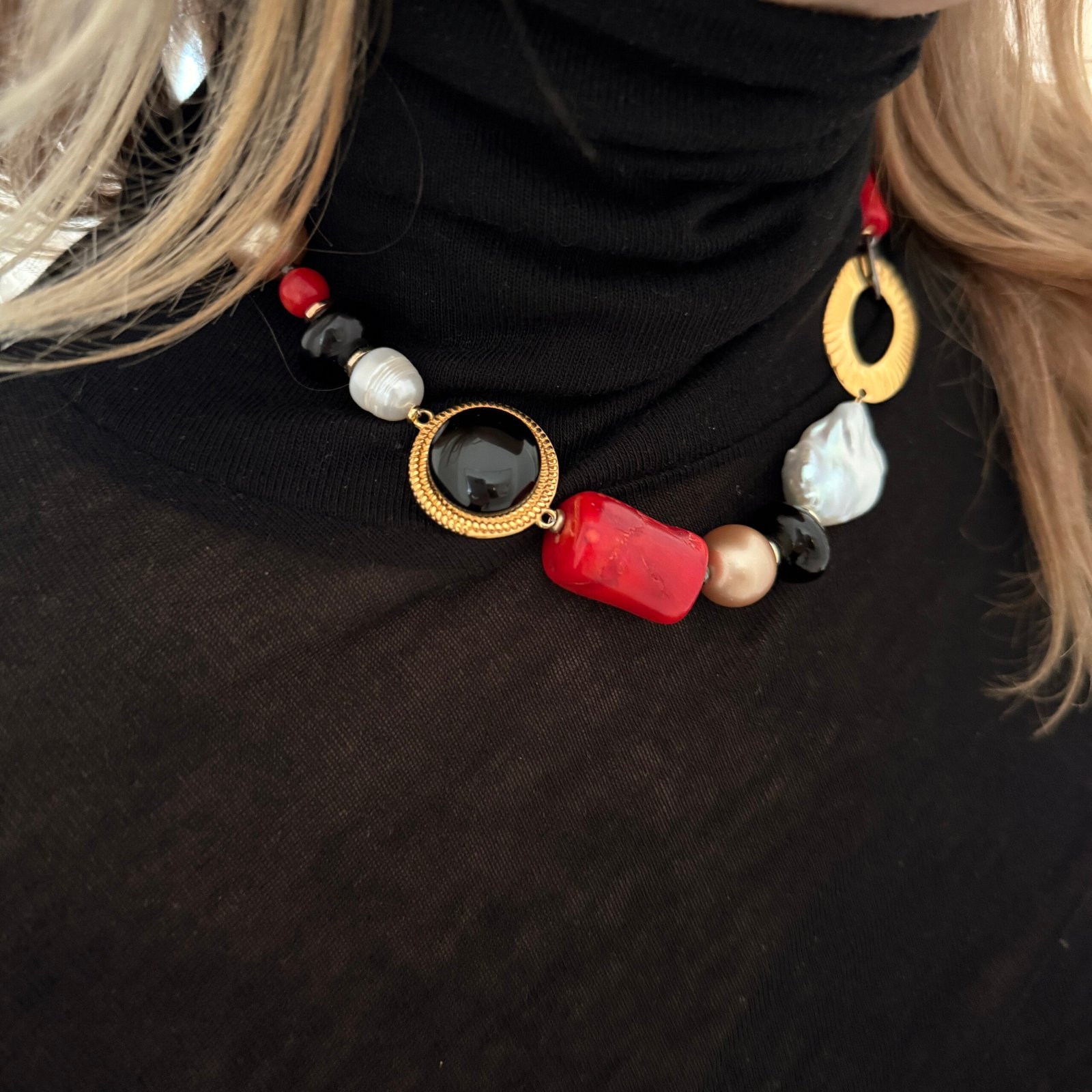 A modern necklace where contrasting textures and rich red and black color accents come together. The combination of agate, glass, pearls, coral, and Swarovski pearls creates a distinctive yet balanced composition.