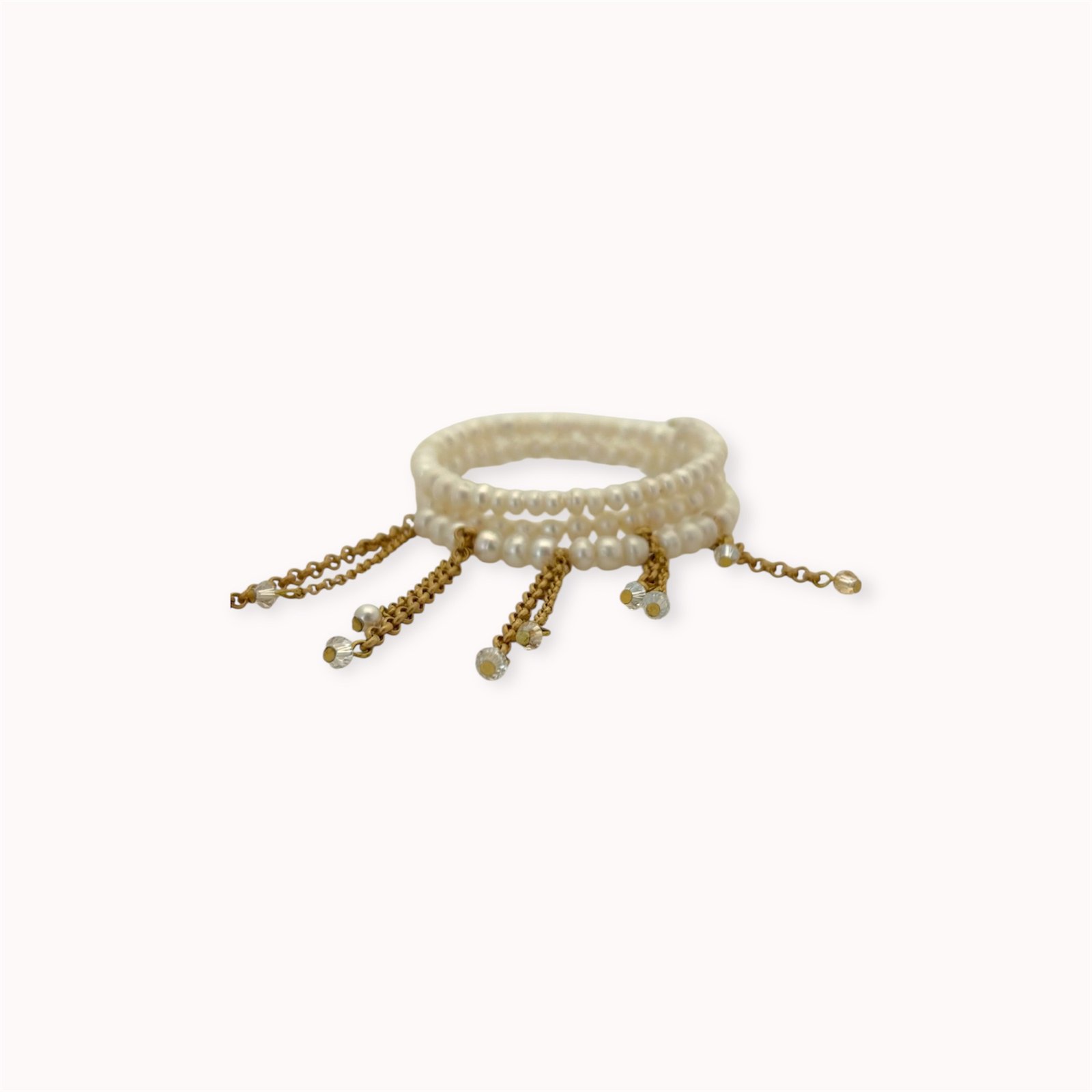 A multi layer pearl bracelet with Swarovski crystals – a subtle yet expressive detail for your look. Different sized pearls create a soft structure, while the delicate chain drops with tiny crystals add movement and a gentle sparkle. The bracelet is made with a steel cable wire which allows for easy adjustment, ensuring a comfortable fit for any wrist size. An elegant piece that stands out effortlessly and complements both everyday wear and special occasions.