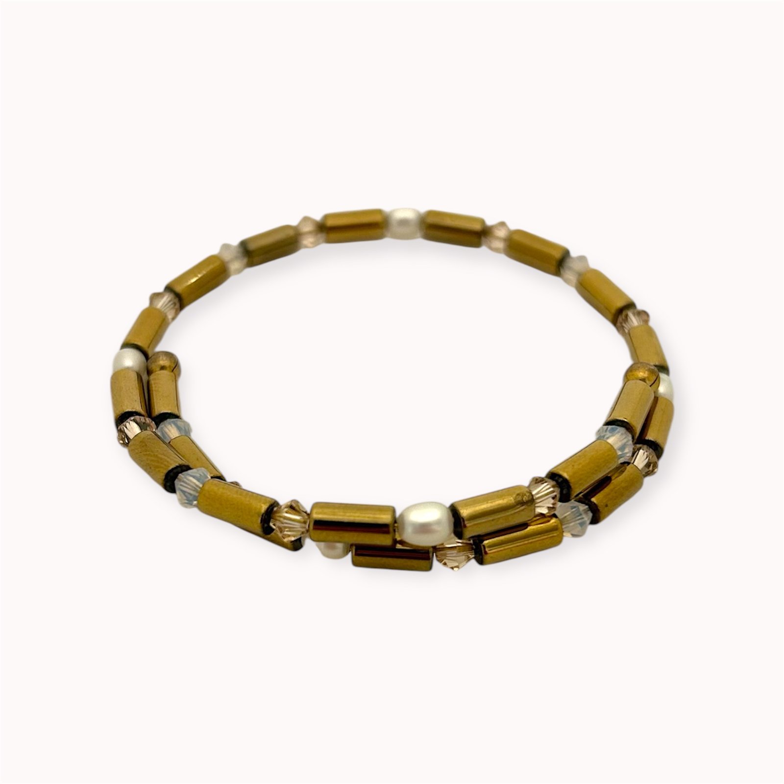 Subtle, with character. This handmade wrap bracelet combines different shapes and textures – gold hematite tubes, Swarovski crystals, and freshwater pearls create something light but expressive. A soft shine and natural accents add a little life to it, balancing simplicity and elegance. When you want something simple, but not completely neutral. Looks beautiful on its own or layered with other bracelets.