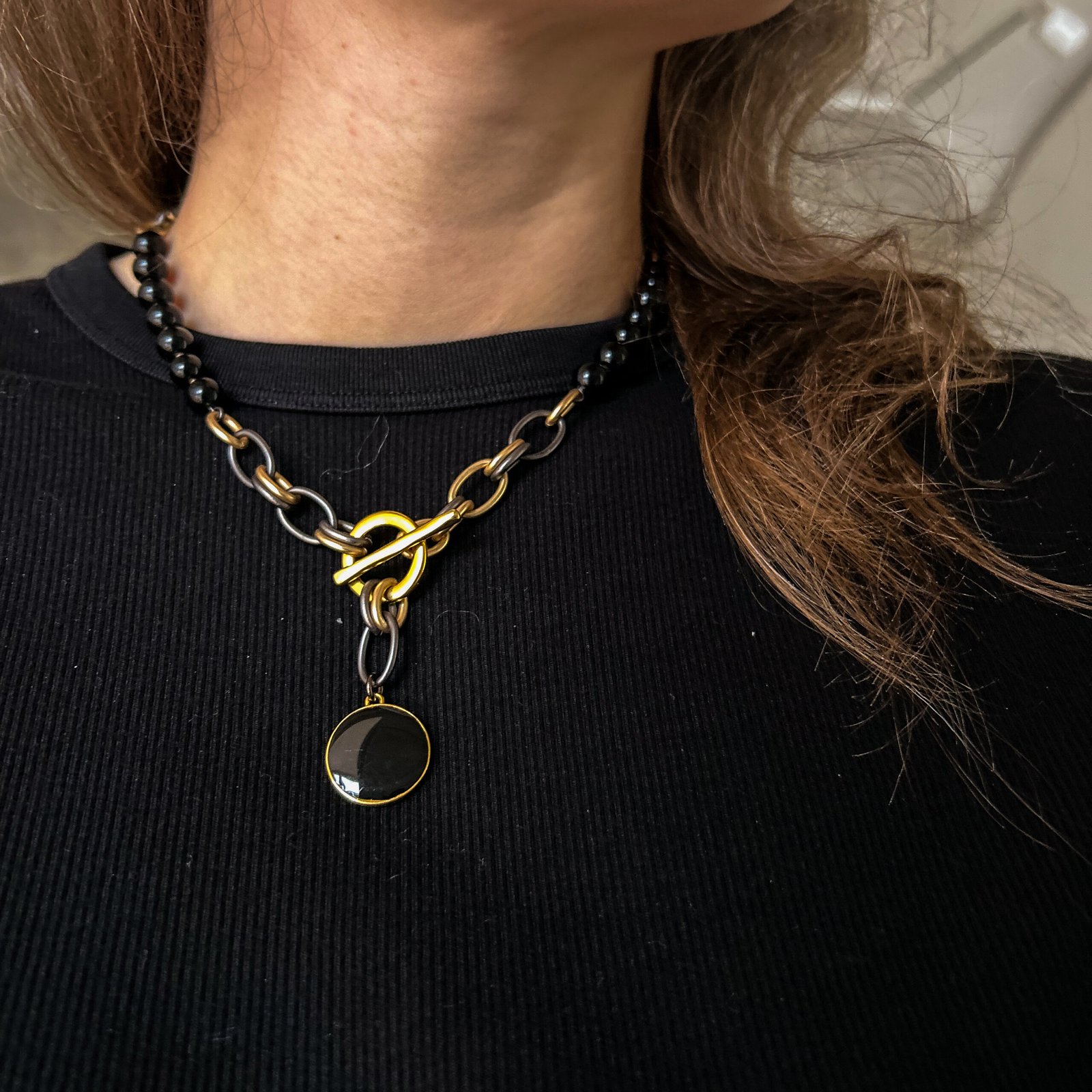 A bold yet elegant necklace combining deep black onyx beads with mixed metal chain details and a gold plated black enamel pendant. The contrast between glossy black stone, warm gold tones, and darker metal accents creates a modern, statement look while remaining refined and wearable. A versatile piece that elevates both everyday outfits and evening styles.